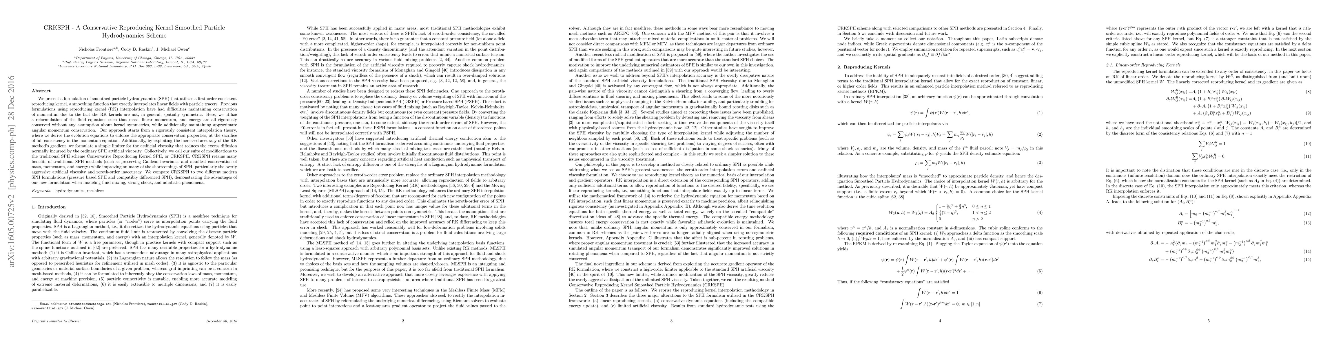 The paper introduces CRKSPH, a modified smoothed particle hydrodynamics scheme that employs a first-order consistent reproducing kernel for exact linear field interpolation, ensuring rigorous conservation of mass, linear momentum, and energy without reliance on kernel symmetry. It also reduces artificial viscosity to mitigate excessive diffusion, demonstrating improved performance over traditional SPH in fluid dynamics simulations.