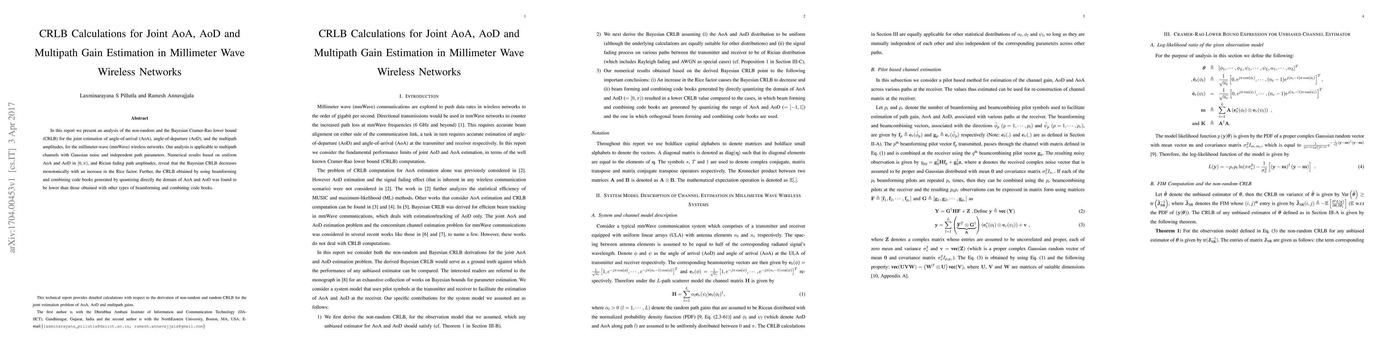 In this report we present an analysis of the non-random and the Bayesian Cramer-Rao lower bound (CRLB) for the joint estimation of angle-of-arrival (AoA), angle-of-departure (AoD), and the multipath amplitudes, for the millimeter-wave (mmWave) wireless networks. Our analysis is applicable to multipath channels with Gaussian noise and independent path parameters. Numerical results based on uniform AoA and AoD in $[0,\pi)$, and Rician fading path amplitudes, reveal that the Bayesian CRLB decreases monotonically with an increase in the Rice factor. Further, the CRLB obtained by using beamforming and combining code books generated by quantizing directly the domain of AoA and AoD was found to be lower than those obtained with other types of beamforming and combining code books.