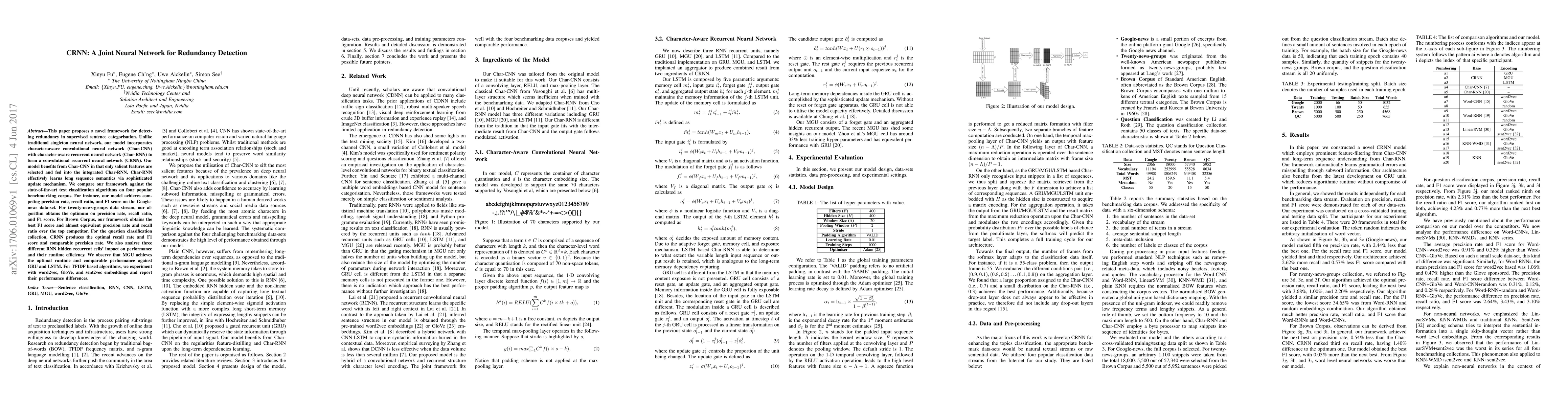 This paper proposes a novel framework for detecting redundancy in supervised sentence categorisation. Unlike traditional singleton neural network, our model incorporates character-aware convolutional neural network (Char-CNN) with character-aware recurrent neural network (Char-RNN) to form a convolutional recurrent neural network (CRNN). Our model benefits from Char-CNN in that only salient features are selected and fed into the integrated Char-RNN. Char-RNN effectively learns long sequence semantics via sophisticated update mechanism. We compare our framework against the state-of-the-art text classification algorithms on four popular benchmarking corpus. For instance, our model achieves competing precision rate, recall ratio, and F1 score on the Google-news data-set. For twenty-news-groups data stream, our algorithm obtains the optimum on precision rate, recall ratio, and F1 score. For Brown Corpus, our framework obtains the best F1 score and almost equivalent precision rate and recall ratio over the top competitor. For the question classification collection, CRNN produces the optimal recall rate and F1 score and comparable precision rate. We also analyse three different RNN hidden recurrent cells' impact on performance and their runtime efficiency. We observe that MGU achieves the optimal runtime and comparable performance against GRU and LSTM. For TFIDF based algorithms, we experiment with word2vec, GloVe, and sent2vec embeddings and report their performance differences.