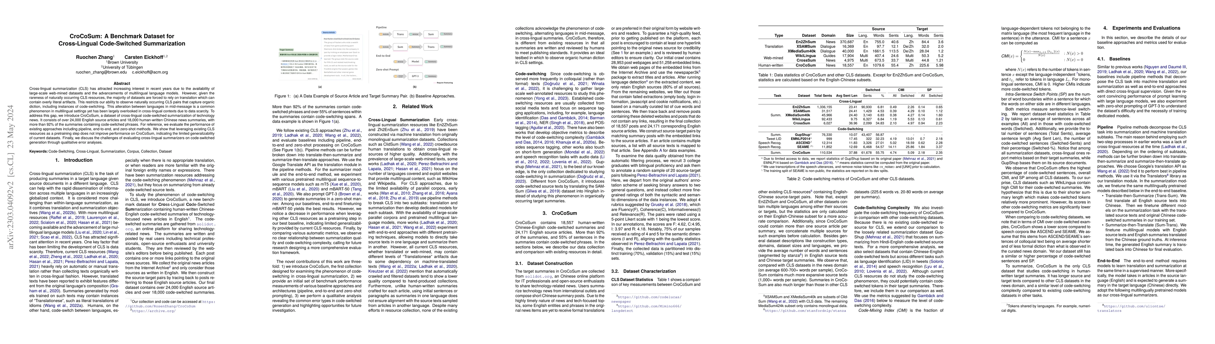 CroCoSum presents a new benchmark dataset for cross-lingual code-switched summarization, featuring over 24,000 English articles and 18,000 Chinese summaries, highlighting the scarcity of natural code-switching in existing datasets. Evaluations reveal limited performance improvements when using conventional cross-lingual summarization methods, underscoring the need for specialized datasets.