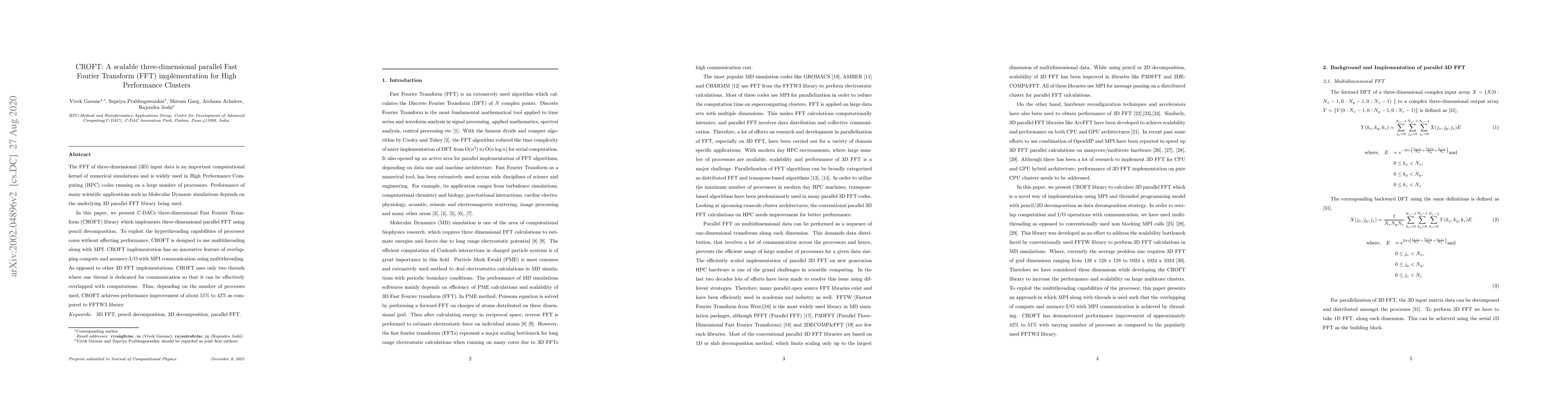 A new library called CROFT offers improved performance for 3D Fast Fourier Transform computations on high-performance clusters, achieving up to 51% better results than existing FFTW3.