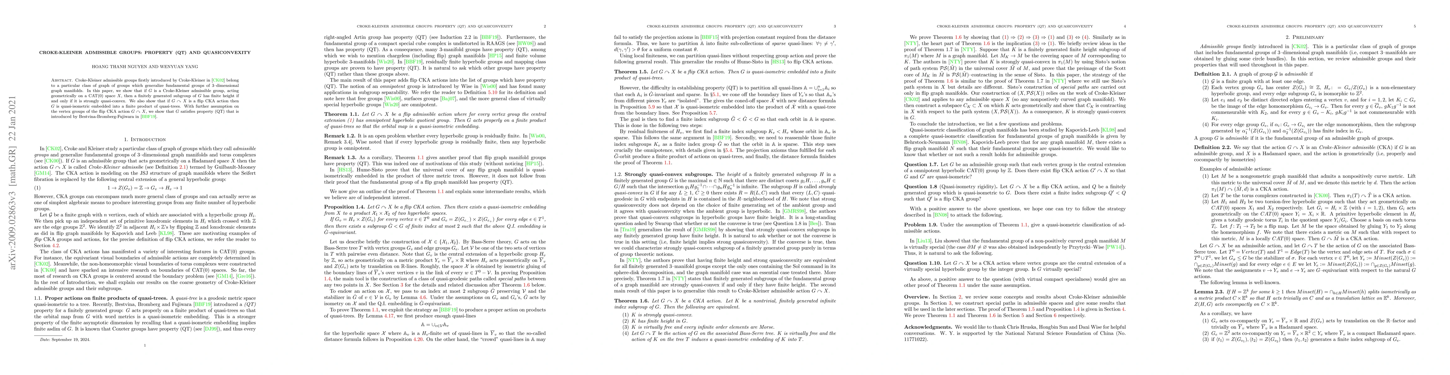 This paper investigates Croke-Kleiner admissible groups, demonstrating that a finitely generated subgroup has finite height if and only if it is strongly quasi-convex. It also proves that under a flip CKA action, these groups are quasi-isometrically embedded into a finite product of quasi-trees and satisfy property (QT) under additional assumptions on vertex groups.