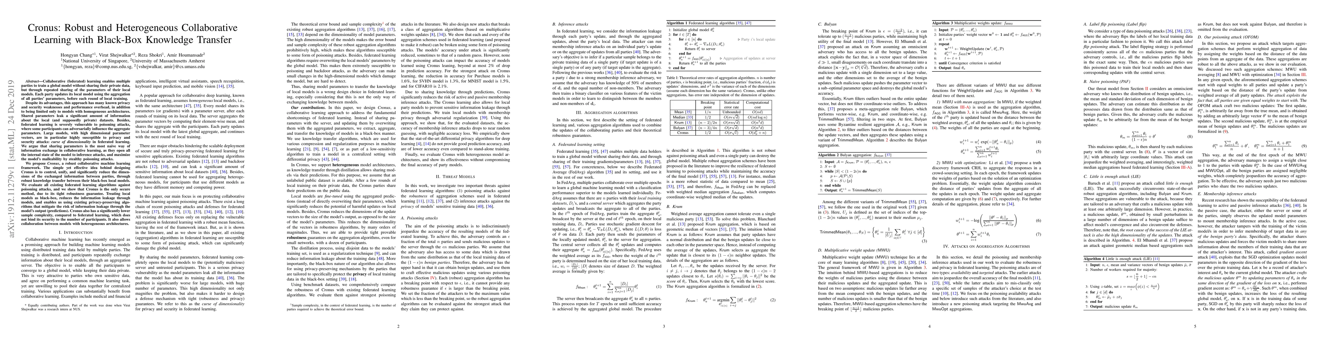 Cronus is a robust collaborative learning framework designed to address privacy and security weaknesses in federated learning by treating local models as black-boxes, thereby minimizing information leakage and reducing susceptibility to poisoning attacks. It achieves this through controlled and reduced dimensions of knowledge transfer, offering tighter security guarantees and lower sample complexity compared to traditional federated learning methods.