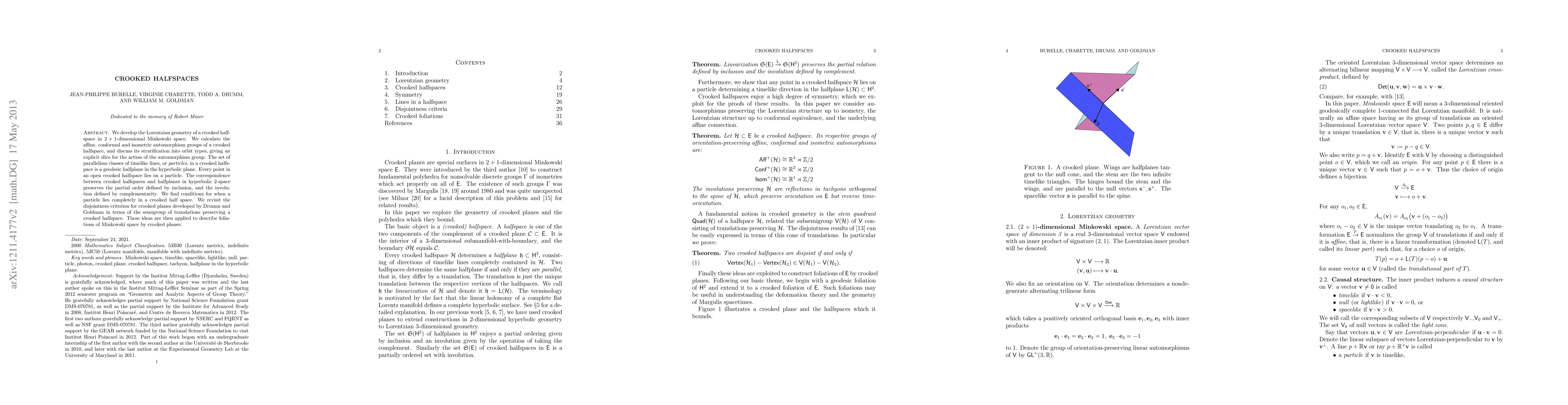 We develop the Lorentzian geometry of a crooked halfspace in 2+1-dimensional Minkowski space. We calculate the affine, conformal and isometric automorphism groups of a crooked halfspace, and discuss its stratification into orbit types, giving an explicit slice for the action of the automorphism group. The set of parallelism classes of timelike lines, or particles, in a crooked halfspace is a geodesic halfplane in the hyperbolic plane. Every point in an open crooked halfspace lies on a particle. The correspondence between crooked halfspaces and halfplanes in hyperbolic 2-space preserves the partial order defined by inclusion, and the involution defined by complementarity. We find conditions for when a particle lies completely in a crooked half space. We revisit the disjointness criterion for crooked planes developed by Drumm and Goldman in terms of the semigroup of translations preserving a crooked halfspace. These ideas are then applied to describe foliations of Minkowski space by crooked planes.