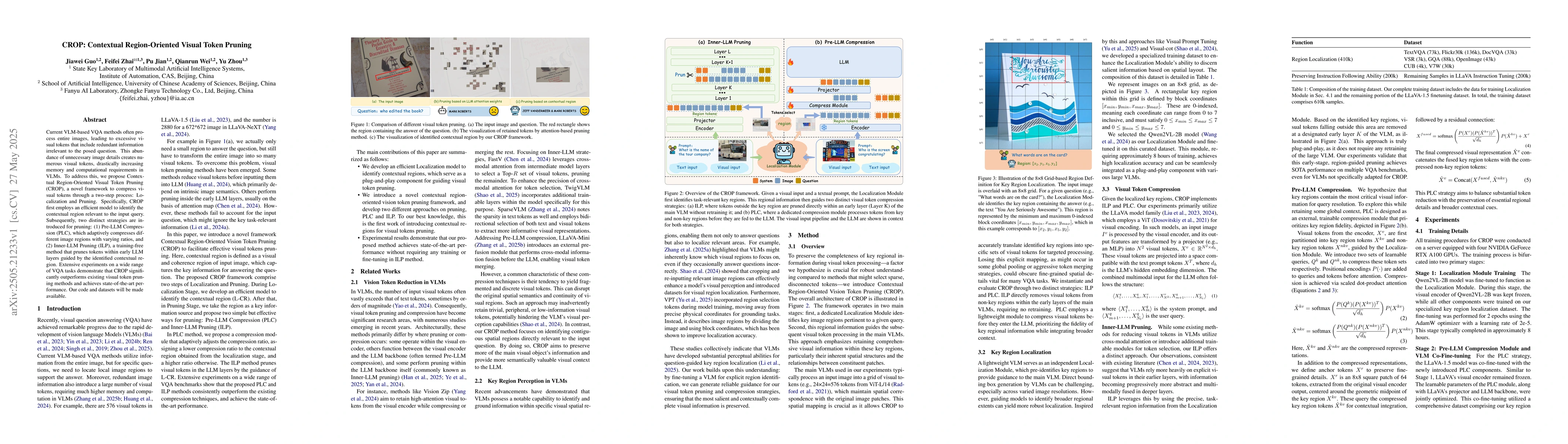 CROP introduces a novel contextual region-oriented approach for visual token pruning, combining localization and adaptive compression strategies.