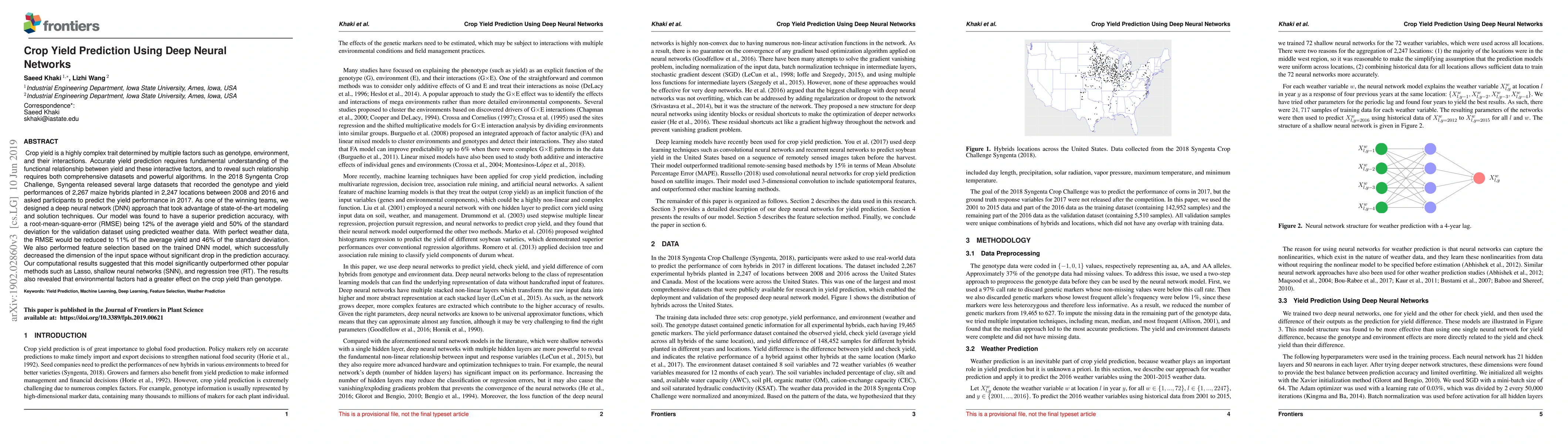This paper presents a deep neural network (DNN) approach for predicting crop yield, achieving superior accuracy with an RMSE of 12% of the average yield. The model outperformed other methods, highlighting the greater impact of environmental factors over genotype on yield.