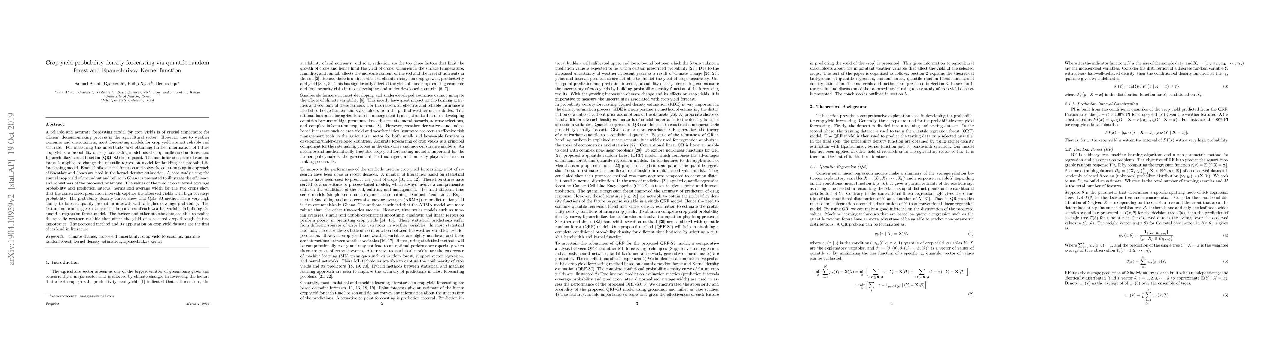 The paper presents a novel hybrid method combining quantile random forest and Epanechnikov kernel function for accurate crop yield probability density forecasting, effectively handling climate variability.