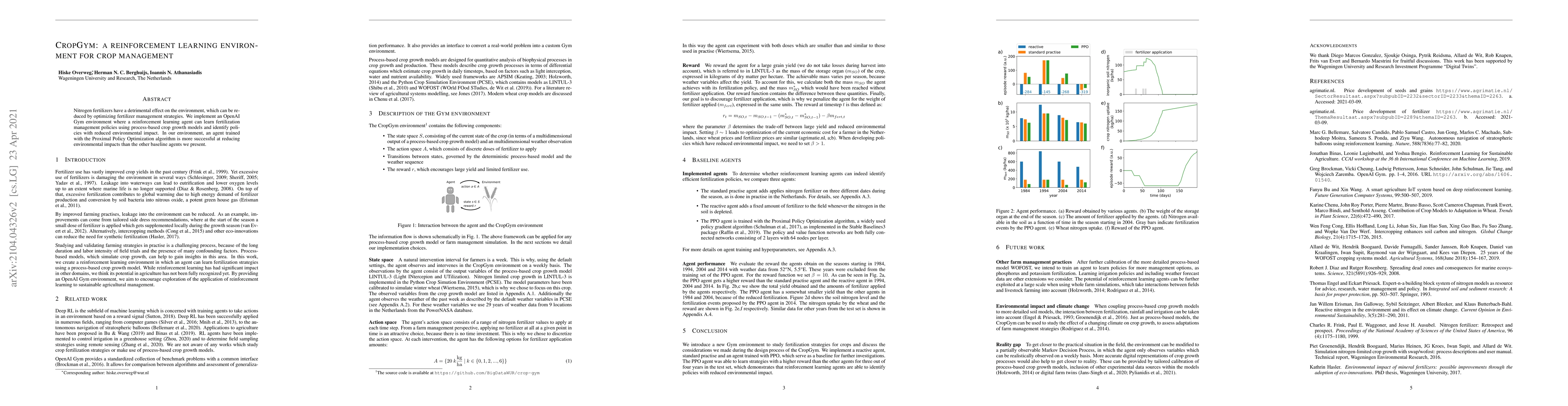 CropGym is a reinforcement learning environment designed to optimize nitrogen fertilizer management, aiming to reduce environmental impacts. Using Proximal Policy Optimization, the trained agent outperforms baselines in minimizing environmental impact through improved fertilization strategies.