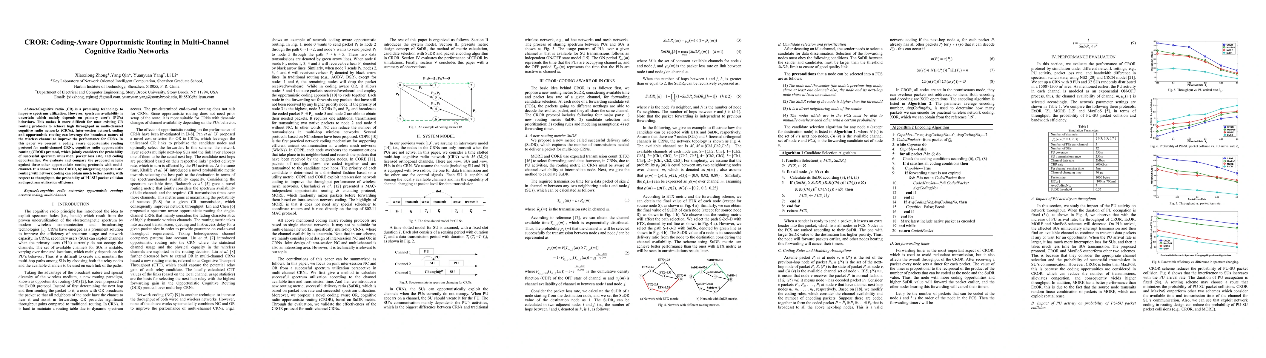 The CROR protocol integrates coding-aware opportunistic routing to enhance throughput and spectrum utilization efficiency in multi-channel cognitive radio networks by considering spectrum availability, packet loss, and coding opportunities. Comparative evaluations show CROR outperforms other opportunistic routing protocols in terms of throughput and collision probability.