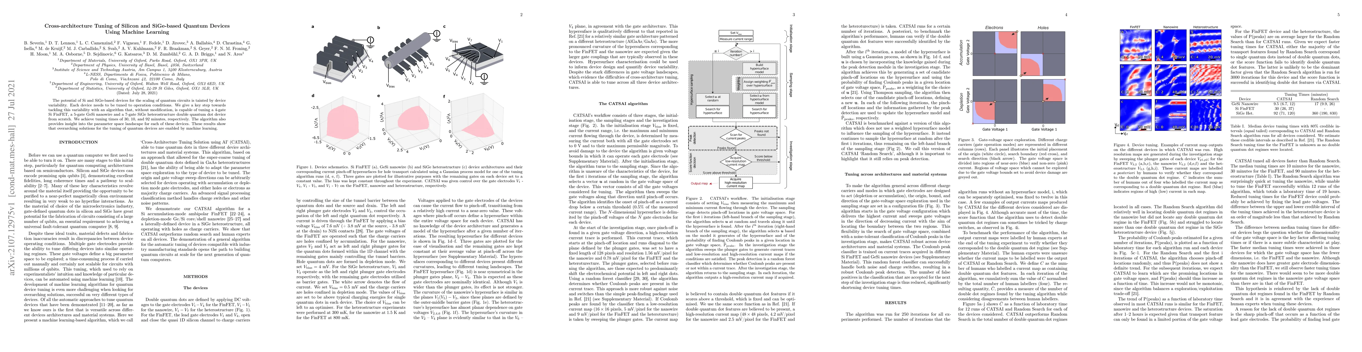 This paper presents a machine learning algorithm that effectively tunes various Si and SiGe-based quantum devices, including a 4-gate Si FinFET, a 5-gate GeSi nanowire, and a 7-gate SiGe heterostructure double quantum dot, achieving tuning times of 30, 10, and 92 minutes respectively. The algorithm provides insights into the parameter space landscape, demonstrating the potential of machine learning to address device variability in quantum circuits.
