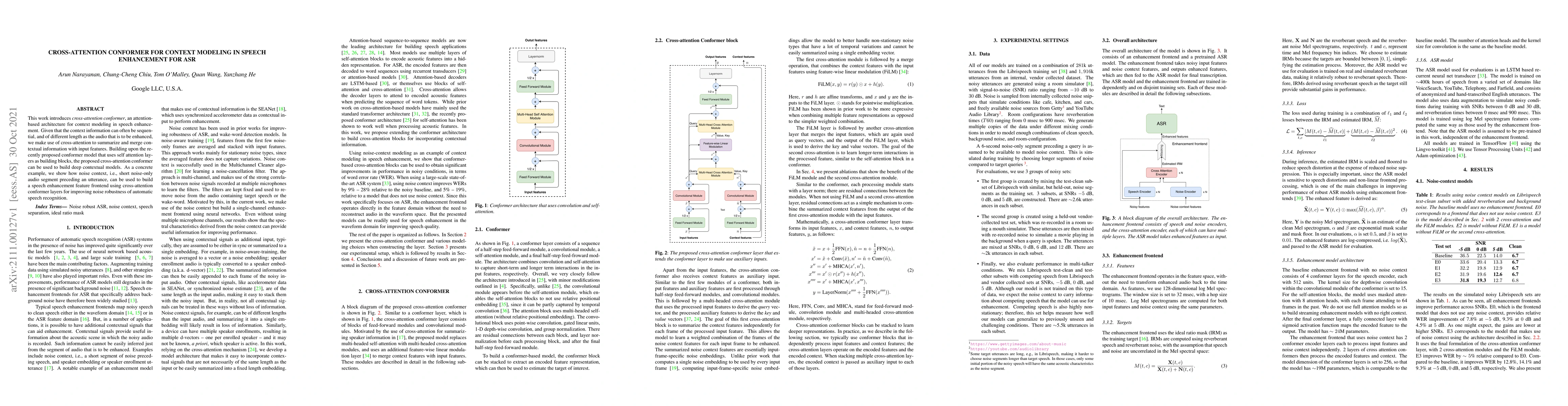 This paper proposes a cross-attention conformer architecture for speech enhancement, utilizing cross-attention to merge contextual information with input features. The model enhances noise robustness in automatic speech recognition by incorporating noise context through cross-attention conformer layers.