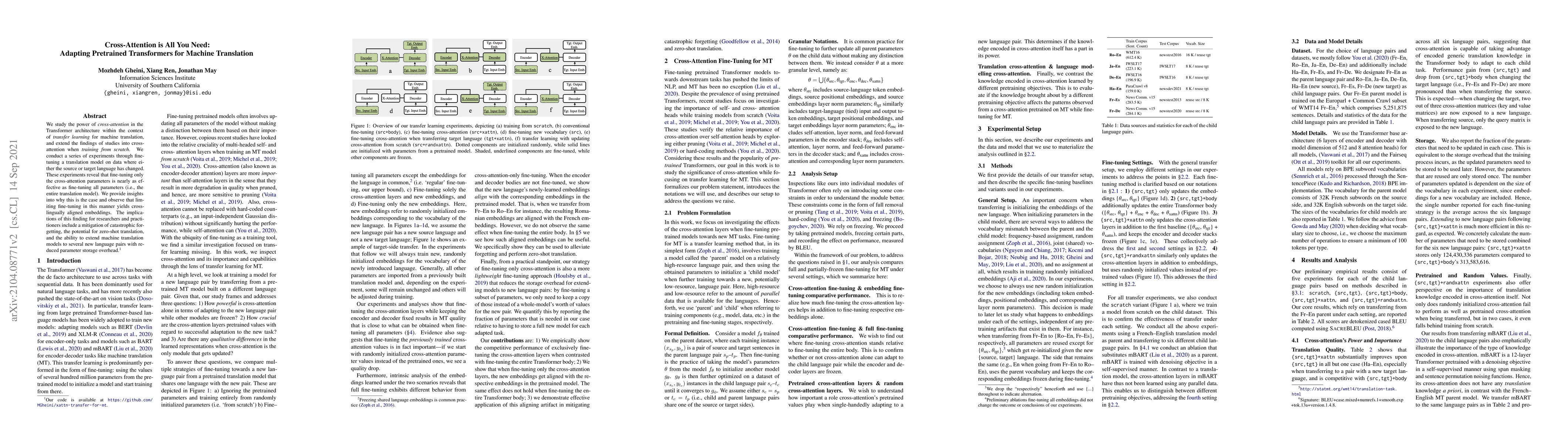 This paper demonstrates that fine-tuning only the cross-attention parameters in pretrained Transformer models for machine translation is nearly as effective as fine-tuning all parameters, suggesting reduced parameter storage overhead and potential for zero-shot translation. The findings highlight the importance of cross-attention in mitigating catastrophic forgetting.