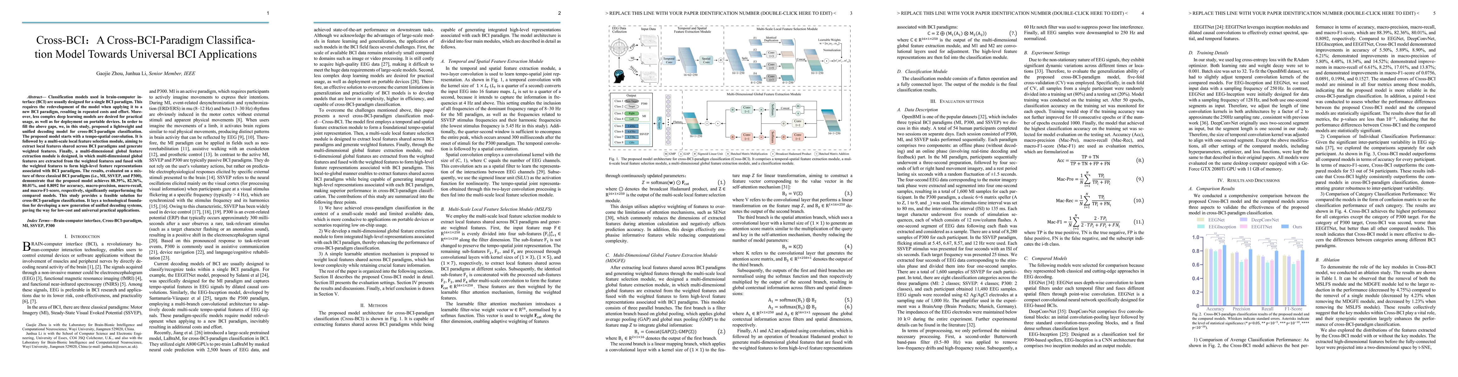 Classification models used in brain-computer interface (BCI) are usually designed for a single BCI paradigm. This requires the redevelopment of the model when applying it to a new BCI paradigm, resulting in repeated costs and effort. Moreover, less complex deep learning models are desired for practical usage, as well as for deployment on portable devices. In or-der to fill the above gaps, we, in this study, proposed a light-weight and unified decoding model for cross-BCI-paradigm classification. The proposed model starts with a tempo-spatial convolution. It is followed by a multi-scale local feature selec-tion module, aiming to extract local features shared across BCI paradigms and generate weighted features. Finally, a mul-ti-dimensional global feature extraction module is designed, in which multi-dimensional global features are extracted from the weighted features and fused with the weighted features to form high-level feature representations associated with BCI para-digms. The results, evaluated on a mixture of three classical BCI paradigms (i.e., MI, SSVEP, and P300), demon-strate that the proposed model achieves 88.39%, 82.36%, 80.01%, and 0.8092 for accuracy, macro-precision, mac-ro-recall, and macro-F1-score, respectively, significantly out-performing the compared models. This study pro-vides a feasible solution for cross-BCI-paradigm classifica-tion. It lays a technological foundation for de-veloping a new generation of unified decoding systems, paving the way for low-cost and universal practical applications.