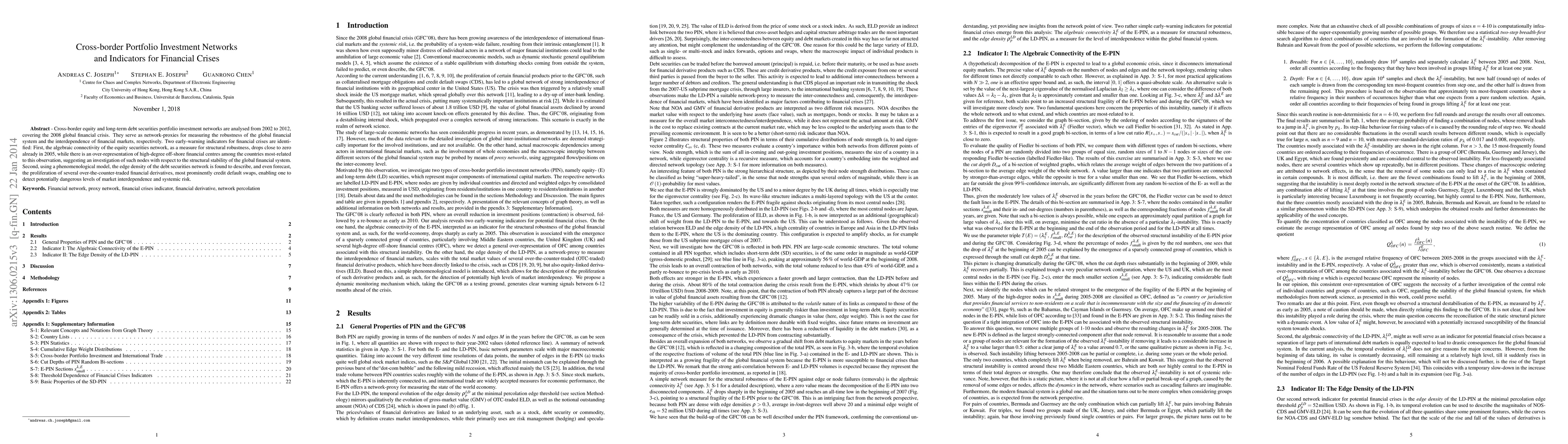 This paper analyzes cross-border portfolio investment networks from 2002 to 2012, identifying two early-warning indicators for financial crises: a drop in the algebraic connectivity of the equity network in 2005 and a rise in edge density of the debt network, which forecasts the proliferation of credit default swaps.