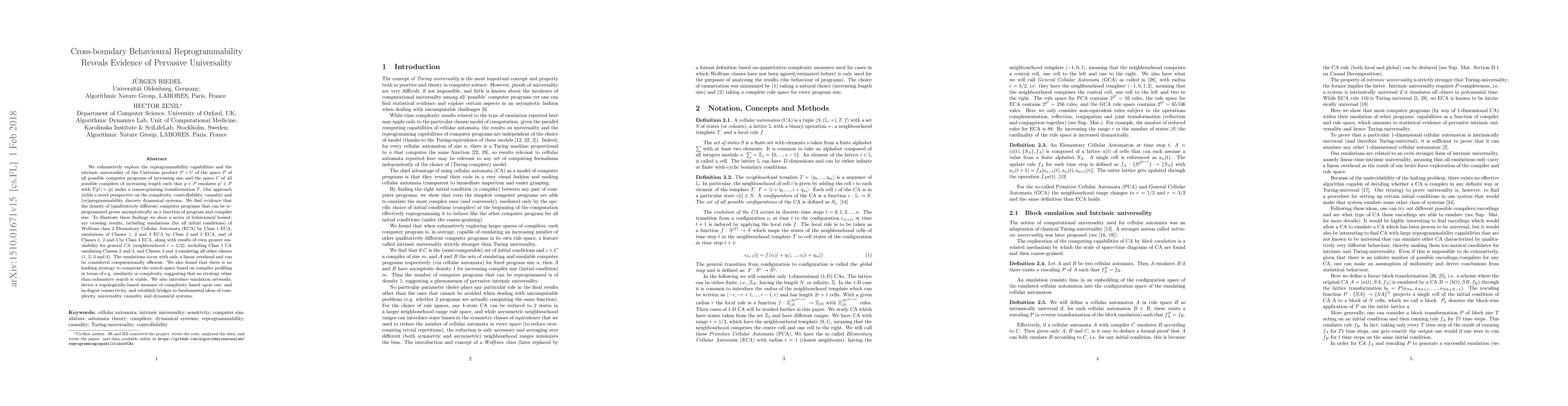 We exhaustively explore the reprogrammability capabilities and the intrinsic universality of the Cartesian product $P \times C$ of the space $P$ of all possible computer programs of increasing size and the space $C$ of all possible compilers of increasing length such that $p \in P$ emulates $p^\prime \in P$ with $T|p^\prime|=|p|$ under a coarse-graining transformation $T$. Our approach yields a novel perspective on the complexity, controllability, causality and (re)programmability discrete dynamical systems. We find evidence that the density of (qualitatively different) computer programs that can be reprogrammed grows asymptotically as a function of program and compiler size. To illustrate these findings we show a series of behavioural boundary crossing results, including emulations (for all initial conditions) of Wolfram class 2 Elementary Cellular Automata (ECA) by Class 1 ECA, emulations of Classes 1, 2 and 3 ECA by Class 2 and 3 ECA, and of Classes 1, 2 and 3 by Class 3 ECA, along with results of even greater emulability for general CA (neighbourhood $r=3/2$), including Class 1 CA emulating Classes 2 and 3, and Classes 3 and 4 emulating all other classes (1, 2, 3 and 4). The emulations occur with only a linear overhead and can be considered computationally efficient. We also found that there is no hacking strategy to compress the search space based on compiler profiling in terms of e.g. similarity or complexity, suggesting that no strategy other than exhaustive search is viable. We also introduce emulation networks, derive a topologically-based measure of complexity based upon out- and in-degree connectivity, and establish bridges to fundamental ideas of complexity, universality, causality and dynamical systems.