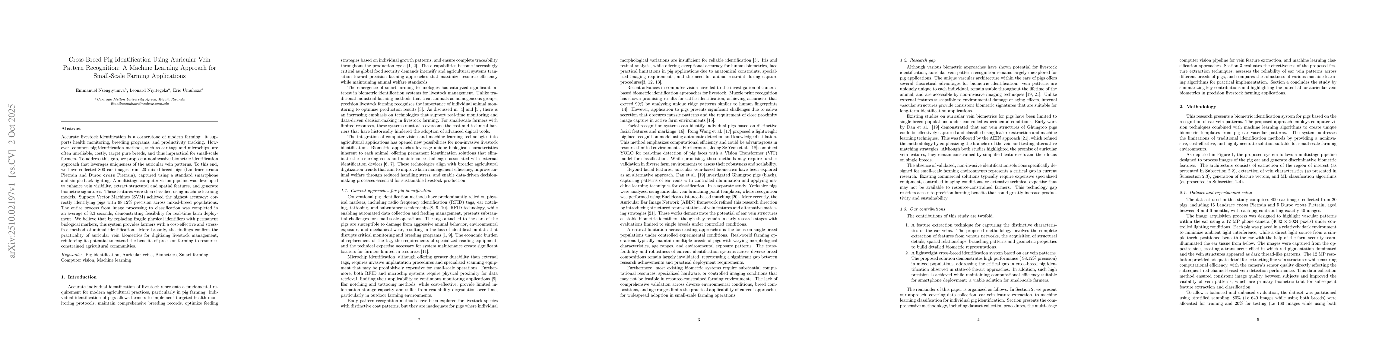The research employs a computer vision approach to extract a 68-dimensional feature vector from auricular vein patterns of pigs. It combines preprocessing techniques like Otsu's thresholding, morphological operations, and CLAHE for contrast enhancement, followed by feature extraction using endpoint and bifurcation statistics, spatial coordinate analysis, and angular histograms.
