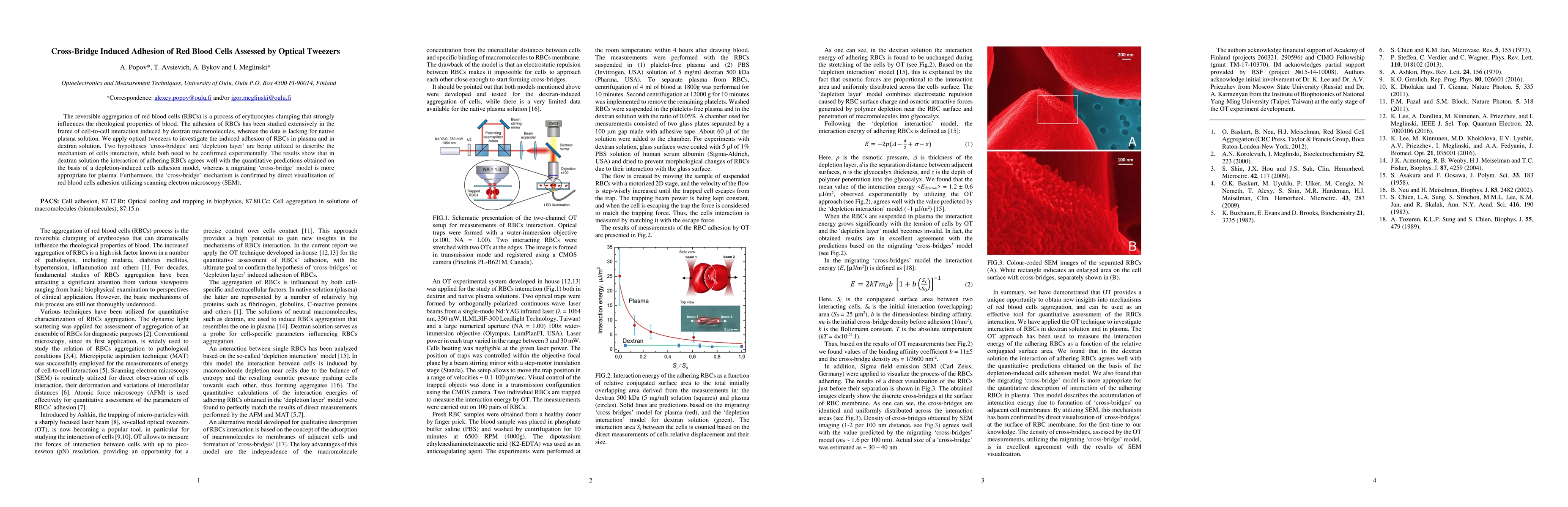 This study uses optical tweezers to investigate red blood cell adhesion in plasma and dextran solutions, confirming the 'cross-bridge' mechanism in plasma and supporting the 'depletion layer' model in dextran, validated by SEM visualization.