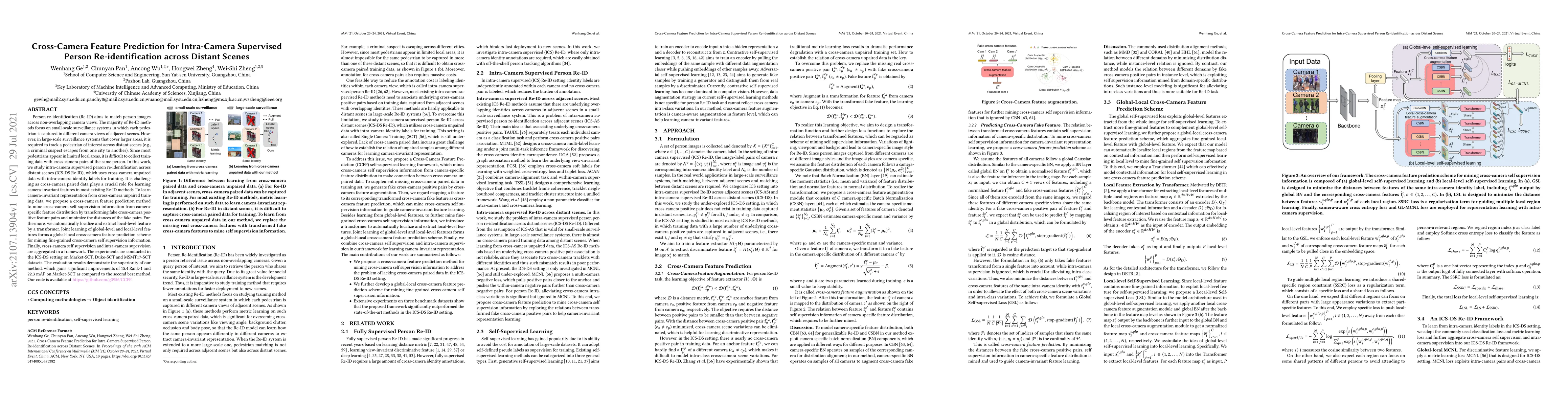 This paper proposes a cross-camera feature prediction method for intra-camera supervised person re-identification across distant scenes, utilizing unpaired cross-camera data and intra-camera labels. The method mines self-supervision from camera-specific feature distributions and combines global and local-level features to achieve camera-invariant representations, showing significant improvements in re-identification accuracy on multiple datasets.