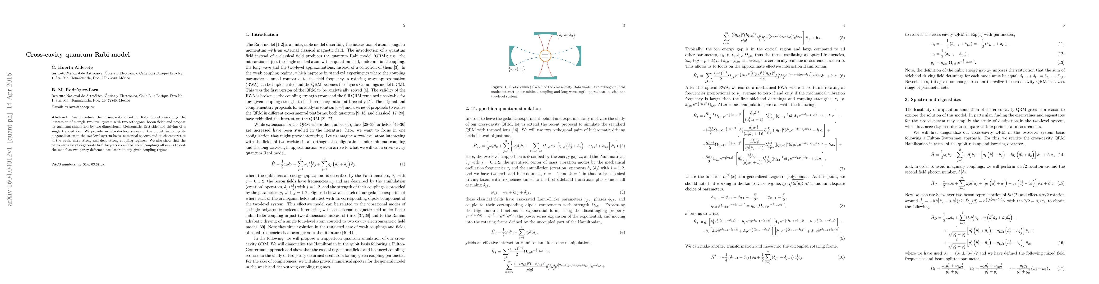 We introduce the cross-cavity quantum Rabi model describing the interaction of a single two-level system with two orthogonal boson fields and propose its quantum simulation by two-dimensional, bichromatic, first-sideband driving of a single trapped ion. We provide an introductory survey of the model, including its diagonalization in the two-level system basis, numerical spectra and its characteristics in the weak, ultra strong and deep strong coupling regimes. We also show that the particular case of degenerate field frequencies and balanced couplings allows us to cast the model as two parity deformed oscillators in any given coupling regime.