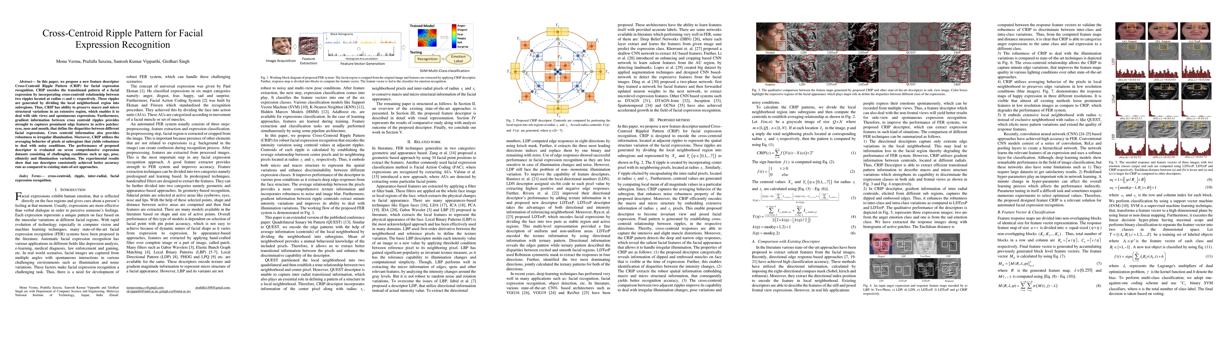 This paper proposes a new feature descriptor, Cross-Centroid Ripple Pattern (CRIP), for facial expression recognition, which captures transitional patterns and edge features of facial expressions, demonstrating superior accuracy across diverse datasets with challenging conditions.
