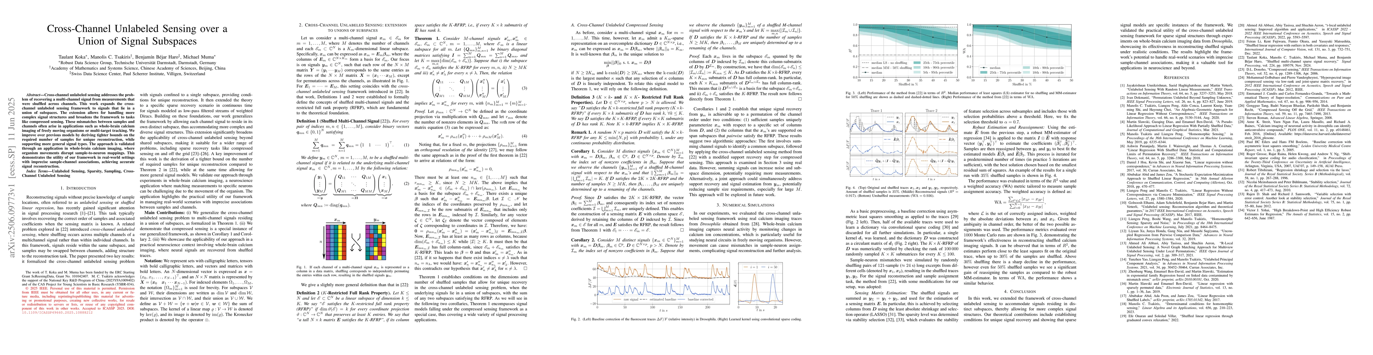 This research paper proposes a framework for recovering multi-channel signals from shuffled measurements in real-world applications like whole-brain calcium imaging. It improves upon previous models by providing tighter bounds on the required number of samples for unique reconstruction.