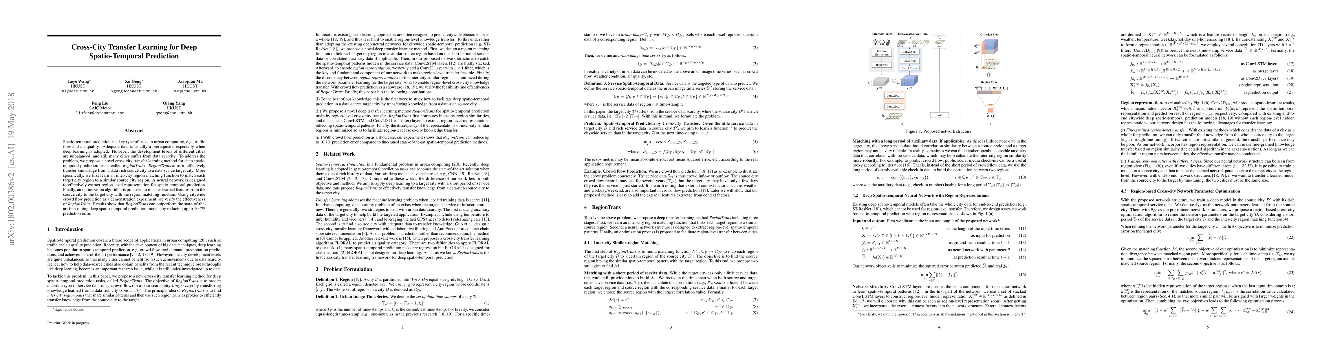 This paper proposes a cross-city transfer learning method called RegionTrans to address data scarcity in spatio-temporal prediction tasks, such as traffic flow prediction, by transferring knowledge from data-rich cities to data-poor ones. The method effectively matches regions between cities and optimizes feature transfer, achieving up to 10.7% reduction in prediction error.