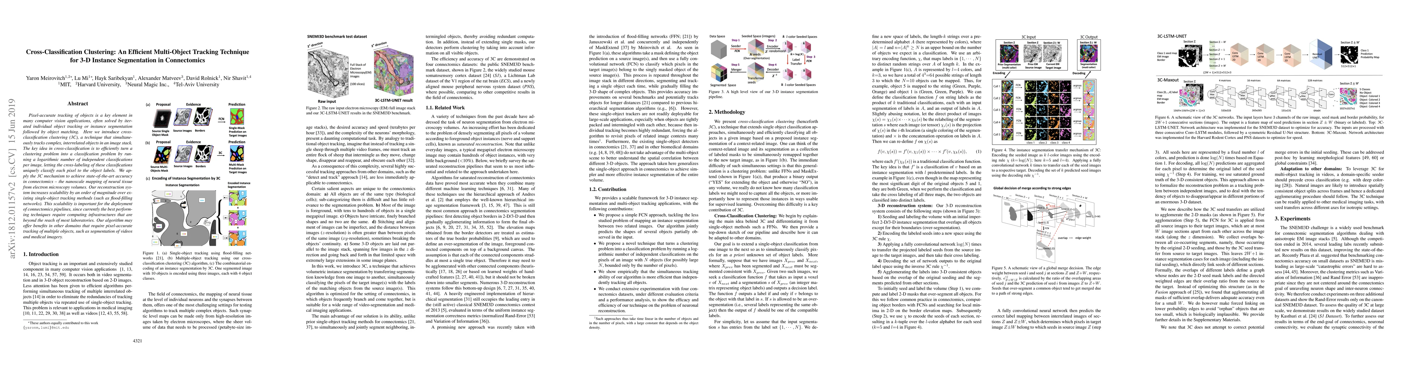 Pixel-accurate tracking of objects is a key element in many computer vision applications, often solved by iterated individual object tracking or instance segmentation followed by object matching. Here we introduce cross-classification clustering (3C), a technique that simultaneously tracks complex, interrelated objects in an image stack. The key idea in cross-classification is to efficiently turn a clustering problem into a classification problem by running a logarithmic number of independent classifications per image, letting the cross-labeling of these classifications uniquely classify each pixel to the object labels. We apply the 3C mechanism to achieve state-of-the-art accuracy in connectomics -- the nanoscale mapping of neural tissue from electron microscopy volumes. Our reconstruction system increases scalability by an order of magnitude over existing single-object tracking methods (such as flood-filling networks). This scalability is important for the deployment of connectomics pipelines, since currently the best performing techniques require computing infrastructures that are beyond the reach of most laboratories. Our algorithm may offer benefits in other domains that require pixel-accurate tracking of multiple objects, such as segmentation of videos and medical imagery.