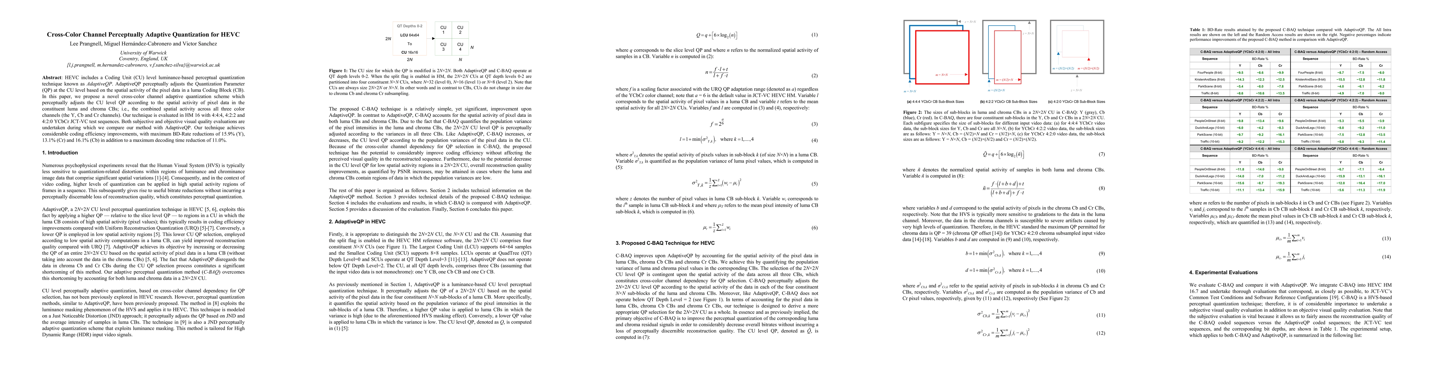 HEVC includes a Coding Unit (CU) level luminance-based perceptual quantization technique known as AdaptiveQP. AdaptiveQP perceptually adjusts the Quantization Parameter (QP) at the CU level based on the spatial activity of raw input video data in a luma Coding Block (CB). In this paper, we propose a novel cross-color channel adaptive quantization scheme which perceptually adjusts the CU level QP according to the spatial activity of raw input video data in the constituent luma and chroma CBs; i.e., the combined spatial activity across all three color channels (the Y, Cb and Cr channels). Our technique is evaluated in HM 16 with 4:4:4, 4:2:2 and 4:2:0 YCbCr JCT-VC test sequences. Both subjective and objective visual quality evaluations are undertaken during which we compare our method with AdaptiveQP. Our technique achieves considerable coding efficiency improvements, with maximum BD-Rate reductions of 15.9% (Y), 13.1% (Cr) and 16.1% (Cb) in addition to a maximum decoding time reduction of 11.0%.