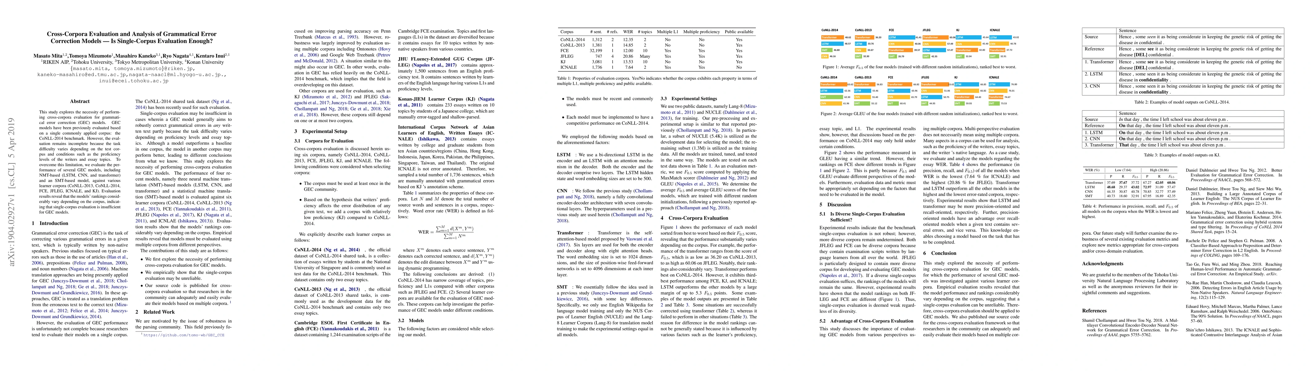 This study explores the necessity of performing cross-corpora evaluation for grammatical error correction (GEC) models. GEC models have been previously evaluated based on a single commonly applied corpus: the CoNLL-2014 benchmark. However, the evaluation remains incomplete because the task difficulty varies depending on the test corpus and conditions such as the proficiency levels of the writers and essay topics. To overcome this limitation, we evaluate the performance of several GEC models, including NMT-based (LSTM, CNN, and transformer) and an SMT-based model, against various learner corpora (CoNLL-2013, CoNLL-2014, FCE, JFLEG, ICNALE, and KJ). Evaluation results reveal that the models' rankings considerably vary depending on the corpus, indicating that single-corpus evaluation is insufficient for GEC models.