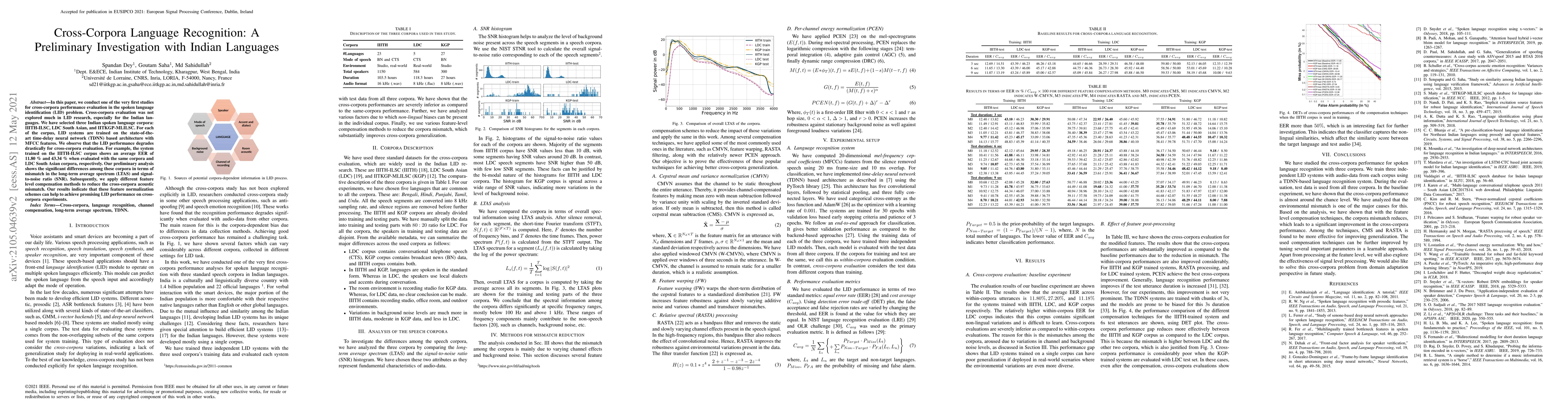 This paper investigates cross-corpora performance in spoken language identification (LID) for Indian languages, revealing significant degradation in LID systems trained on different corpora. Feature normalization techniques show promise in mitigating cross-corpora acoustic mismatches.