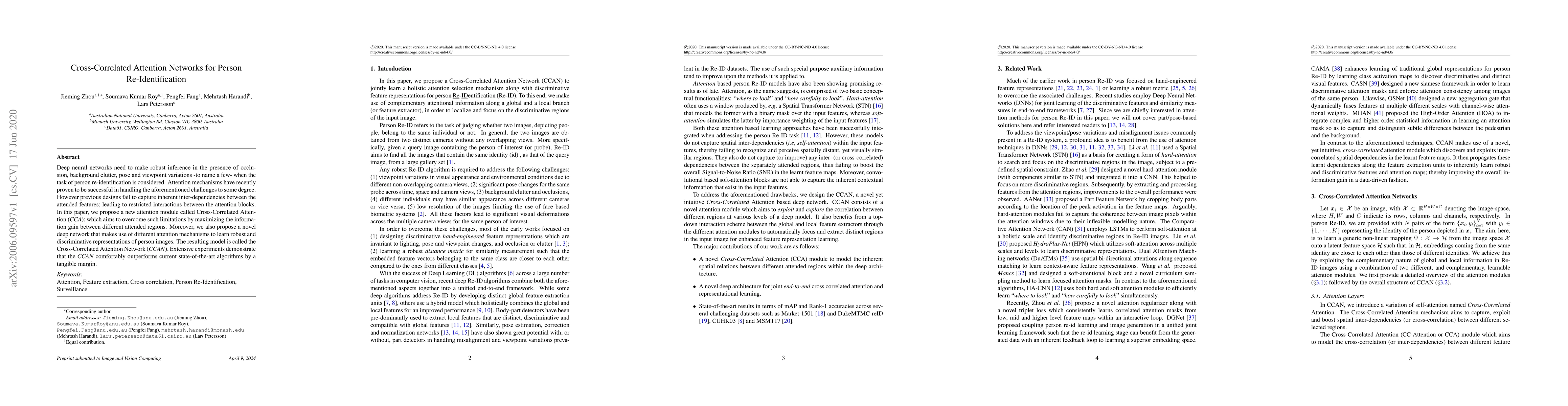 This paper introduces Cross-Correlated Attention (CCA) to enhance person re-identification by capturing inter-dependencies between attended features, leading to improved robustness. The proposed Cross-Correlated Attention Network (CCAN) outperforms existing methods, achieving better performance in the presence of occlusions and variations.
