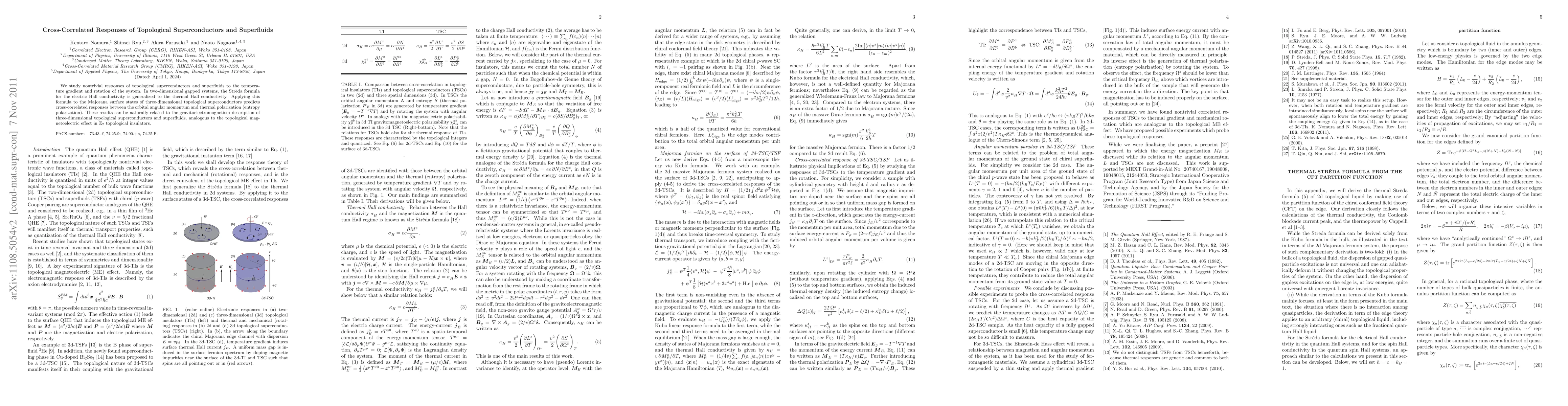 This research investigates the cross-correlated responses of topological superconductors and superfluids to temperature gradients and rotation, revealing a generalized Strèda formula for thermal Hall conductivity in 2D gapped systems. It predicts a connection between orbital angular momentum and thermal polarization in Majorana surface states of 3D topological superconductors, linking these findings to gravitoelectromagnetism.