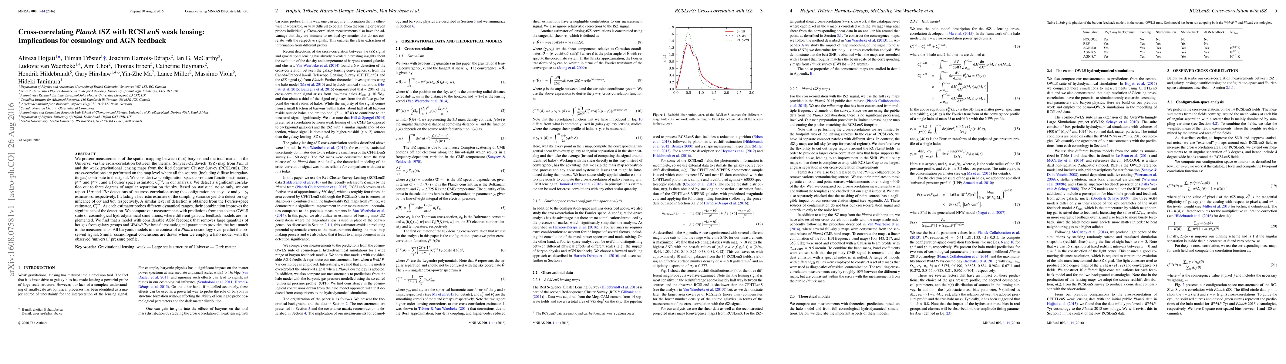 This paper reports a significant cross-correlation between the Planck tSZ map and RCSLenS weak lensing maps, indicating a strong spatial mapping between hot baryons and total matter. The study finds that a model with AGN feedback and WMAP-7yr cosmological parameters best fits the observed signal, suggesting that AGN feedback plays a crucial role in shaping the distribution of hot gas.