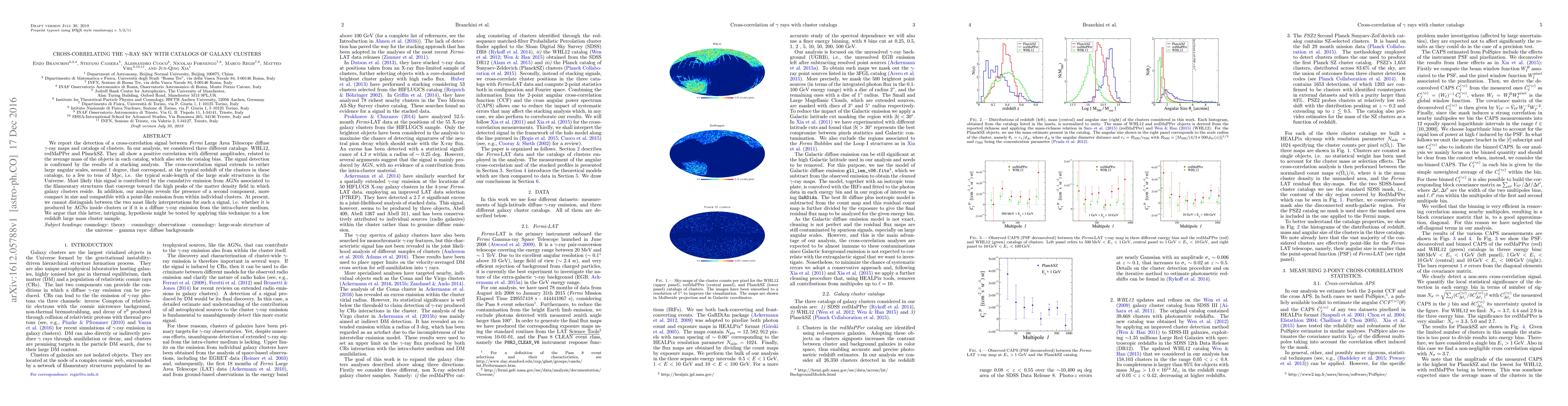 We report the detection of a cross-correlation signal between {\it Fermi} Large Area Telescope diffuse gamma-ray maps and catalogs of clusters. In our analysis, we considered three different catalogs: WHL12, redMaPPer and PlanckSZ. They all show a positive correlation with different amplitudes, related to the average mass of the objects in each catalog, which also sets the catalog bias. The signal detection is confirmed by the results of a stacking analysis. The cross-correlation signal extends to rather large angular scales, around 1 degree, that correspond, at the typical redshift of the clusters in these catalogs, to a few to tens of Mpc, i.e. the typical scale-length of the large scale structures in the Universe. Most likely this signal is contributed by the cumulative emission from AGNs associated to the filamentary structures that converge toward the high peaks of the matter density field in which galaxy clusters reside. In addition, our analysis reveals the presence of a second component, more compact in size and compatible with a point-like emission from within individual clusters. At present, we cannot distinguish between the two most likely interpretations for such a signal, i.e. whether it is produced by AGNs inside clusters or if it is a diffuse gamma-ray emission from the intra-cluster medium. We argue that this latter, intriguing, hypothesis might be tested by applying this technique to a low redshift large mass cluster sample.