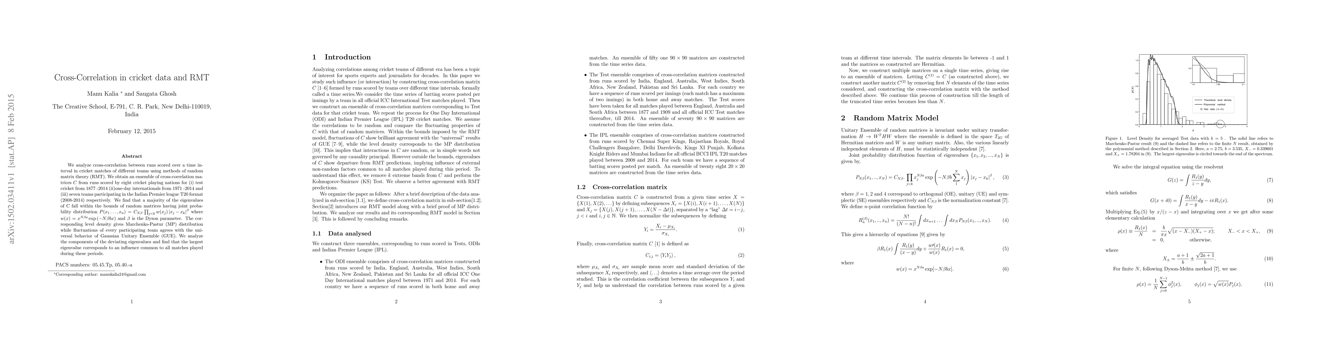 cricket matches of different teams using methods of random matrix theory (RMT).