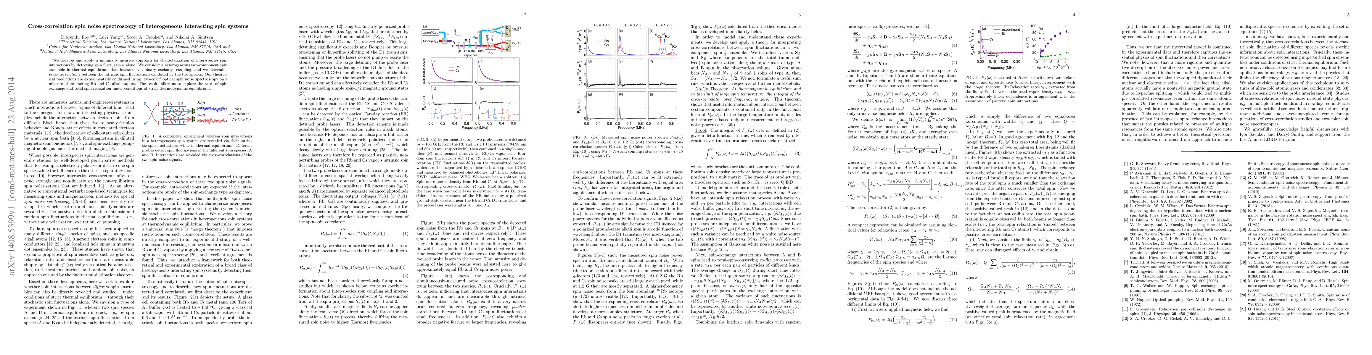 We develop and apply a minimally invasive approach for characterization of inter-species spin interactions by detecting spin fluctuations alone. We consider a heterogeneous two-component spin ensemble in thermal equilibrium that interacts via binary exchange coupling, and we determine cross-correlations between the intrinsic spin fluctuations exhibited by the two species. Our theoretical predictions are experimentally confirmed using `two-color' optical spin noise spectroscopy on a mixture of interacting Rb and Cs alkali vapors. The results allow us to explore the rates of spin exchange and total spin relaxation under conditions of strict thermodynamic equilibrium.