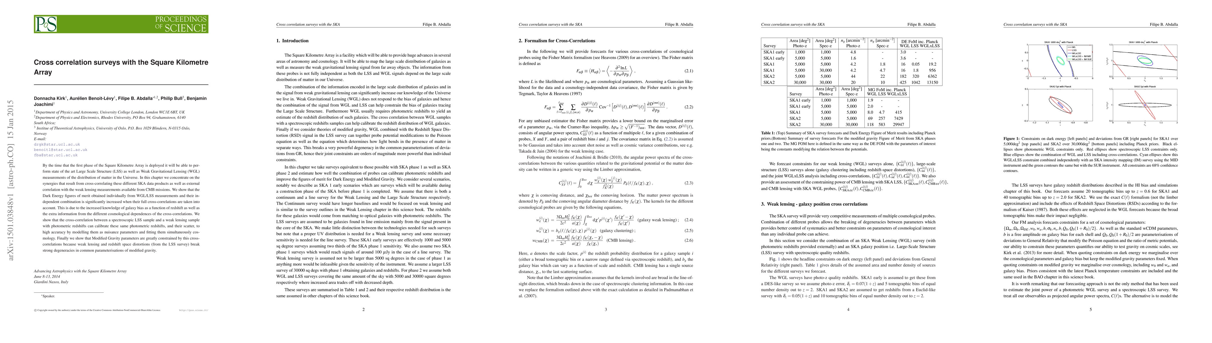 By the time that the first phase of the Square Kilometre Array is deployed it will be able to perform state of the art Large Scale Structure (LSS) as well as Weak Gravitational Lensing (WGL) measurements of the distribution of matter in the Universe. In this chapter we concentrate on the synergies that result from cross-correlating these different SKA data products as well as external correlation with the weak lensing measurements available from CMB missions. We show that the Dark Energy figures of merit obtained individually from WGL/LSS measurements and their independent combination is significantly increased when their full cross-correlations are taken into account. This is due to the increased knowledge of galaxy bias as a function of redshift as well as the extra information from the different cosmological dependences of the cross-correlations. We show that the cross-correlation between a spectroscopic LSS sample and a weak lensing sample with photometric redshifts can calibrate these same photometric redshifts, and their scatter, to high accuracy by modelling them as nuisance parameters and fitting them simultaneously cosmology. Finally we show that Modified Gravity parameters are greatly constrained by this cross-correlations because weak lensing and redshift space distortions (from the LSS survey) break strong degeneracies in common parameterisations of modified gravity.