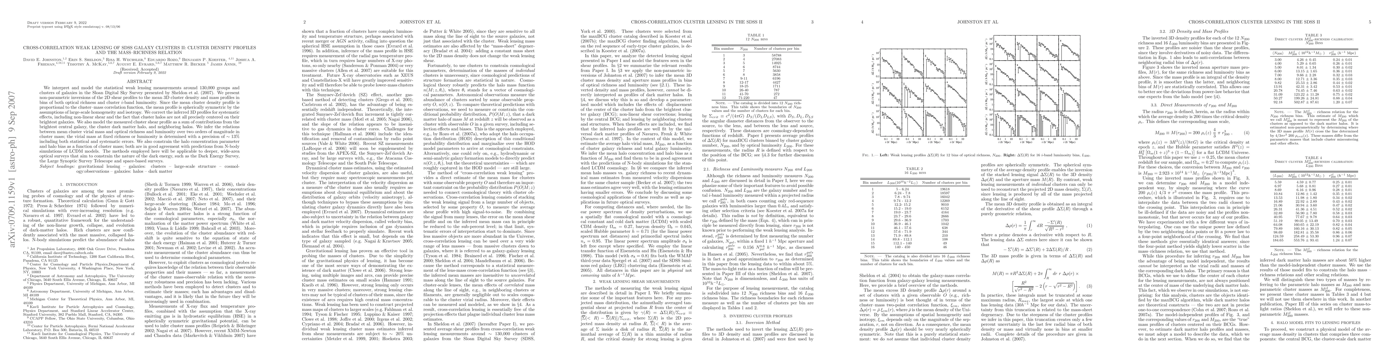 This paper analyzes weak lensing measurements around galaxy clusters from the Sloan Digital Sky Survey to determine 3D cluster density and mass profiles, correlating these with optical richness and luminosity. It finds precise mass-richness relations and supports LCDM model predictions, with methods applicable to future dark energy surveys.