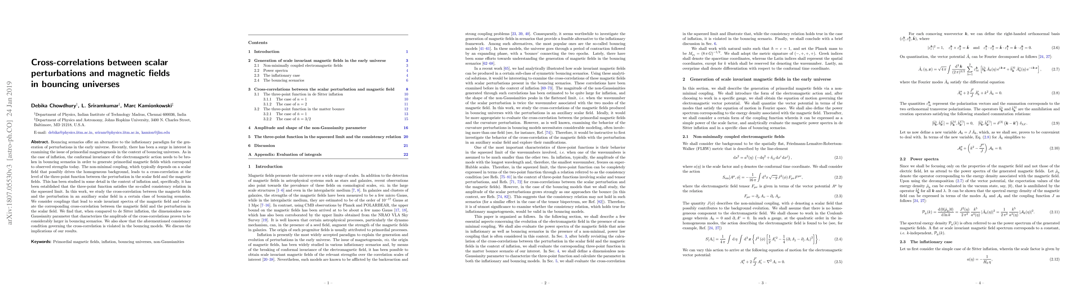 Bouncing scenarios offer an alternative to the inflationary paradigm for the generation of perturbations in the early universe. Recently, there has been a surge in interest in examining the issue of primordial magnetogenesis in the context of bouncing universes. As in the case of inflation, the conformal invariance of the electromagnetic action needs to be broken in bouncing scenarios in order to generate primordial magnetic fields which correspond to observed strengths today. The non-minimal coupling, which typically depends on a scalar field that possibly drives the homogeneous background, leads to a cross-correlation at the level of the three-point function between the perturbation in the scalar field and the magnetic fields. This has been studied in some detail in the context of inflation and, specifically, it has been established that the three-point function satisfies the so-called consistency relation in the squeezed limit. In this work, we study the cross-correlation between the magnetic fields and the perturbation in an auxiliary scalar field in a certain class of bouncing scenarios. We consider couplings that lead to scale invariant spectra of the magnetic field and evaluate the corresponding cross-correlation between the magnetic field and the perturbation in the scalar field. We find that, when compared to de Sitter inflation, the dimensionless non-Gaussianity parameter that characterizes the amplitude of the cross-correlations proves to be considerably larger in bouncing scenarios. We also show that the aforementioned consistency condition governing the cross-correlation is violated in the bouncing models. We discuss the implications of our results.