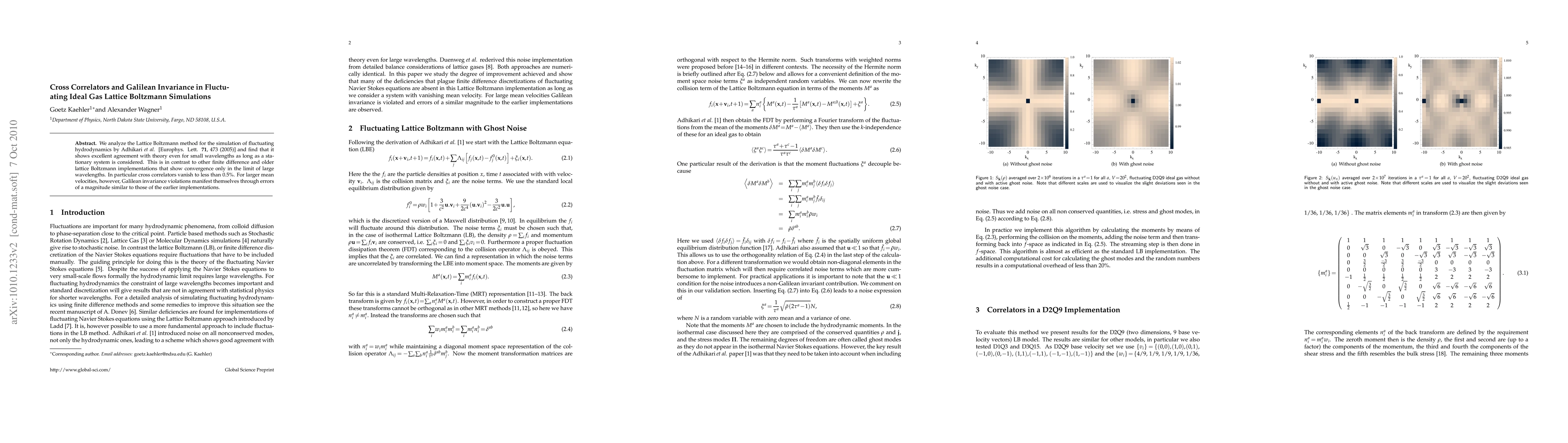 We analyze the Lattice Boltzmann method for the simulation of fluctuating hydrodynamics by Adhikari et al. [Europhys. Lett. 71, 473 (2005)] and find that it shows excellent agreement with theory even for small wavelengths as long as a stationary system is considered. This is in contrast to other finite difference and older lattice Boltzmann implementations that show convergence only in the limit of large wavelengths. In particular cross correlators vanish to less than 0.5%. For larger mean velocities, however, Galilean invariance violations manifest themselves through errors of a magnitude similar to those of the earlier implementations.