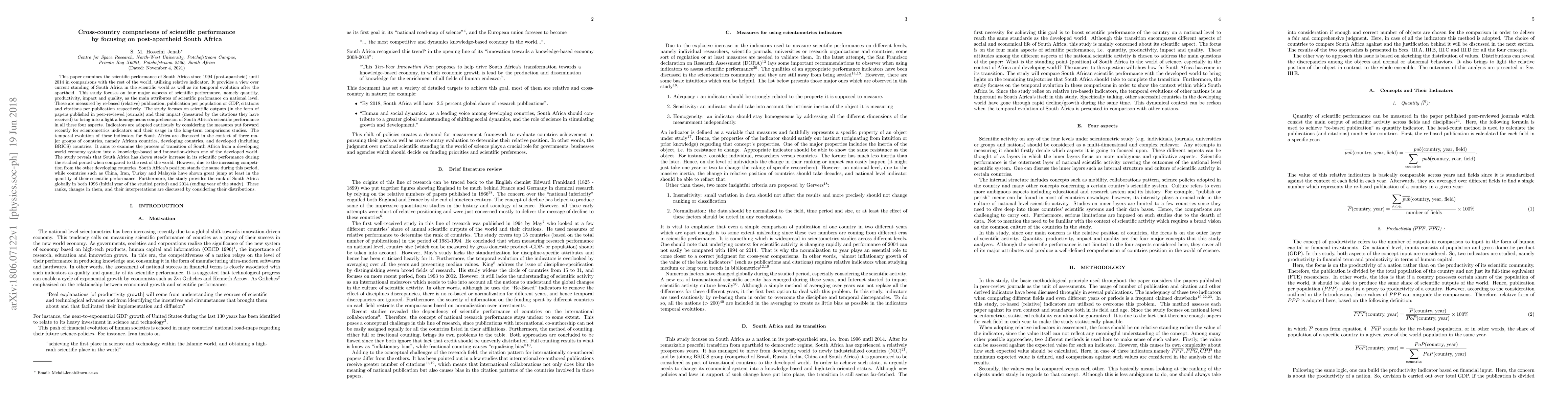 This paper evaluates South Africa's scientific performance from 1994 to 2014, comparing it globally using relative indicators. It finds a steady increase in scientific outputs but notes South Africa's position remains unchanged due to rising competition from other developing nations.