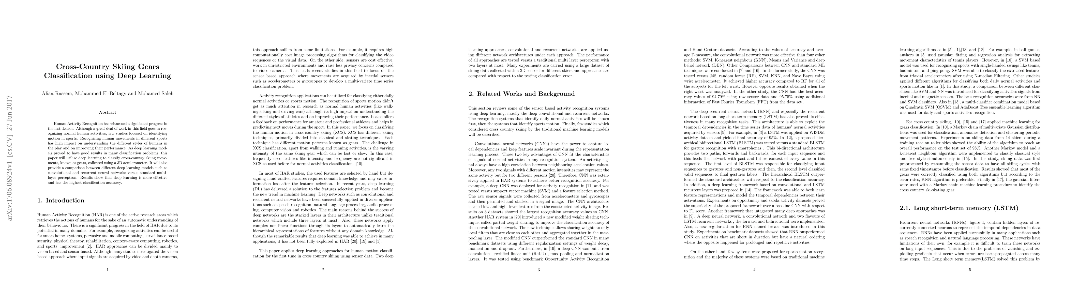 Human Activity Recognition has witnessed a significant progress in the last decade. Although a great deal of work in this field goes in recognizing normal human activities, few studies focused on identifying motion in sports. Recognizing human movements in different sports has high impact on understanding the different styles of humans in the play and on improving their performance. As deep learning models proved to have good results in many classification problems, this paper will utilize deep learning to classify cross-country skiing movements, known as gears, collected using a 3D accelerometer. It will also provide a comparison between different deep learning models such as convolutional and recurrent neural networks versus standard multi-layer perceptron. Results show that deep learning is more effective and has the highest classification accuracy.