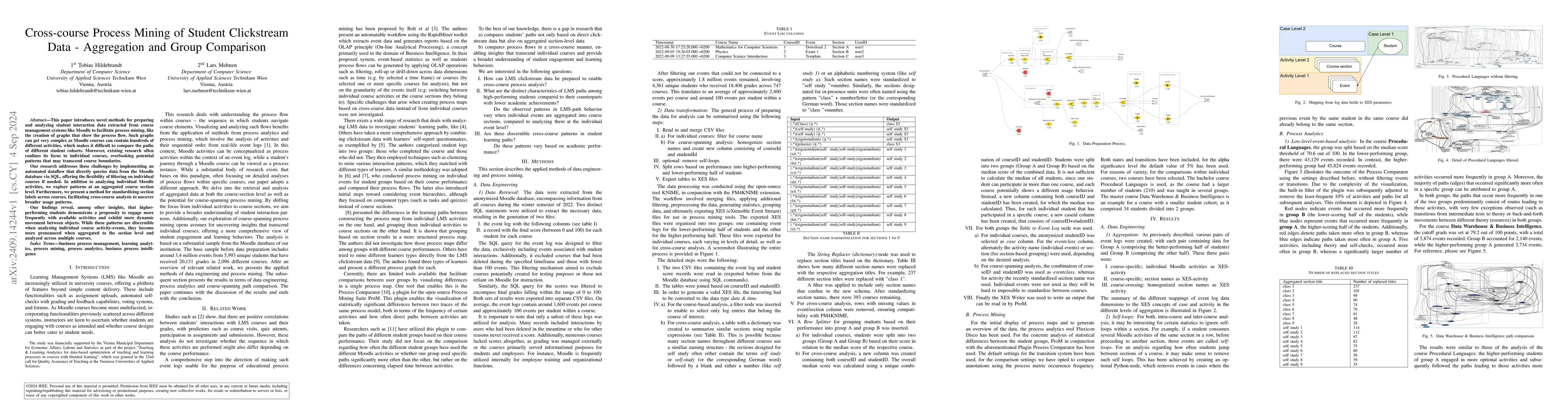 This paper introduces novel methods for preparing and analyzing student interaction data extracted from course management systems like Moodle to facilitate process mining, like the creation of graphs that show the process flow. Such graphs can get very complex as Moodle courses can contain hundreds of different activities, which makes it difficult to compare the paths of different student cohorts. Moreover, existing research often confines its focus to individual courses, overlooking potential patterns that may transcend course boundaries. Our research addresses these challenges by implementing an automated dataflow that directly queries data from the Moodle database via SQL, offering the flexibility of filtering on individual courses if needed. In addition to analyzing individual Moodle activities, we explore patterns at an aggregated course section level. Furthermore, we present a method for standardizing section labels across courses, facilitating cross-course analysis to uncover broader usage patterns. Our findings reveal, among other insights, that higher-performing students demonstrate a propensity to engage more frequently with available activities and exhibit more dynamic movement between objects. While these patterns are discernible when analyzing individual course activity-events, they become more pronounced when aggregated to the section level and analyzed across multiple courses.