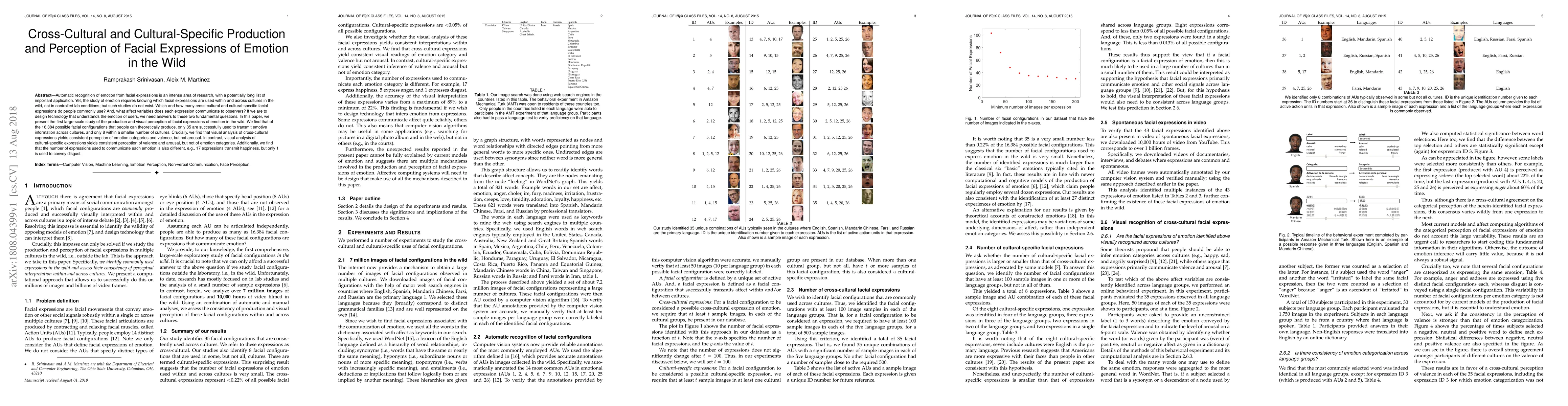 This paper investigates the cross-cultural and cultural-specific use of facial expressions to convey emotions in natural settings, revealing that only 35 out of 16,384 possible facial configurations are commonly used across cultures, while only 8 are culturally specific. It finds consistent perception of emotion categories and valence across cultures, but not arousal, whereas cultural-specific expressions show consistent perception of valence and arousal but not emotion categories.