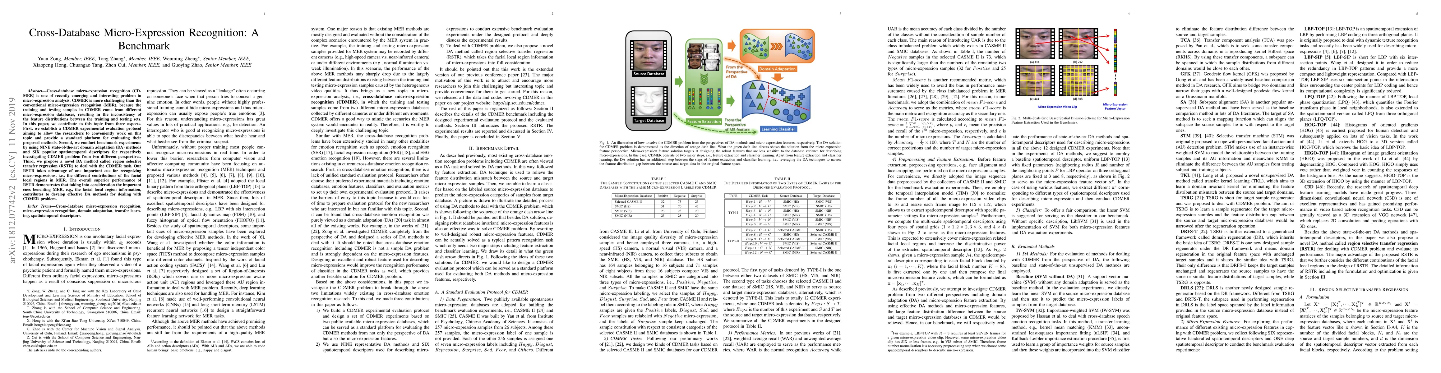 This paper introduces a benchmark for cross-database micro-expression recognition (CDMER) and proposes a novel domain adaptation method called region selective transfer regression (RSTR). The study evaluates nine state-of-the-art domain adaptation methods and six spatiotemporal descriptors to investigate CDMER, demonstrating that considering facial local region contributions enhances recognition performance.