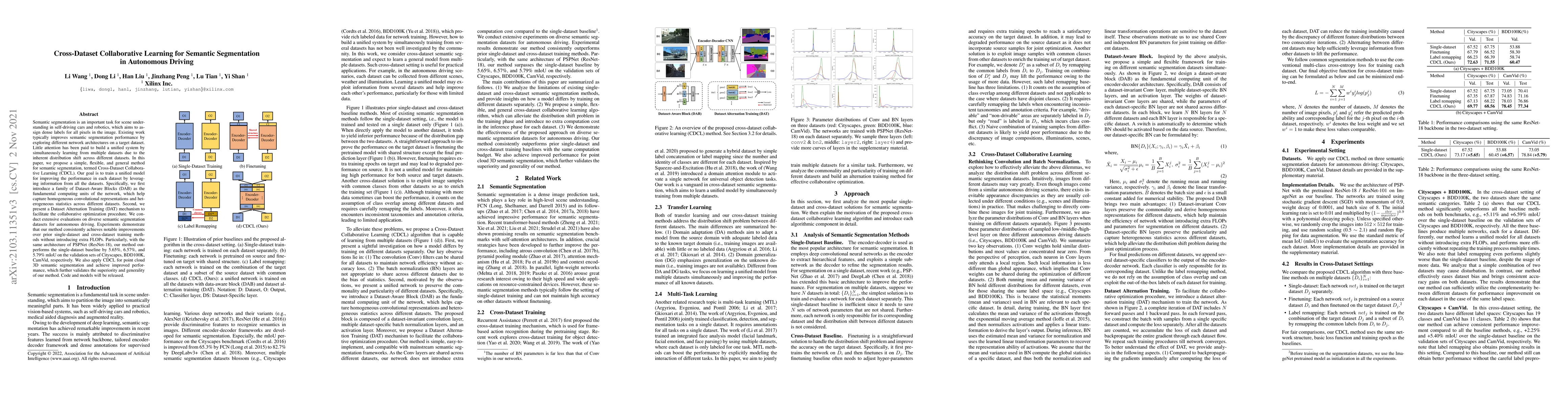 This paper proposes Cross-Dataset Collaborative Learning (CDCL) for semantic segmentation in autonomous driving, introducing Dataset-Aware Blocks and Dataset Alternation Training to improve model performance across multiple datasets. Experiments show significant gains over single-dataset methods without additional computational costs.