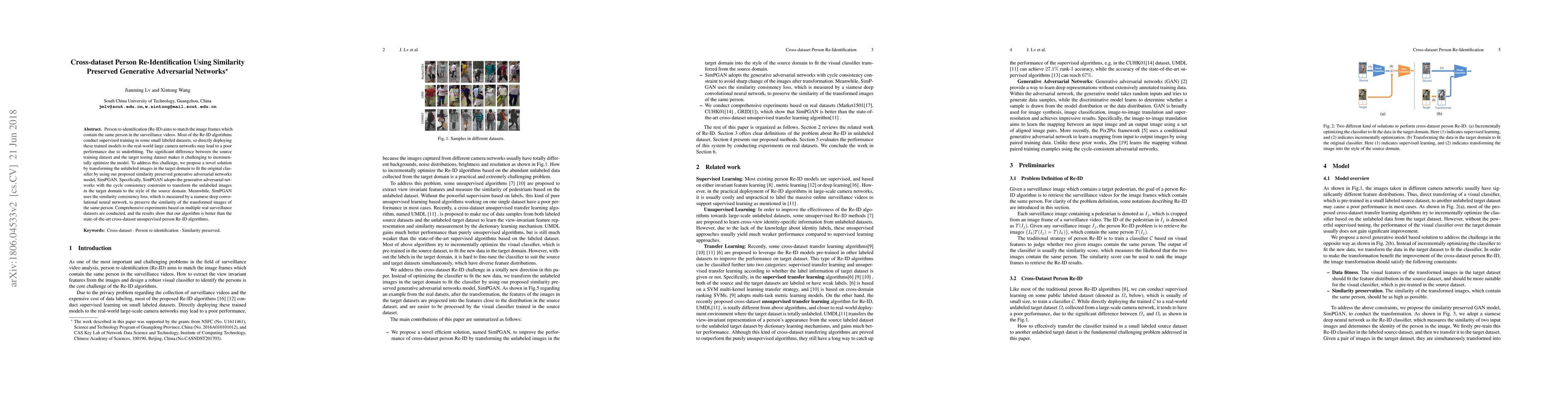 This paper proposes SimPGAN, a similarity preserved generative adversarial network to address the challenge of cross-dataset person re-identification. SimPGAN transforms unlabeled target domain images to match the source domain style while preserving the similarity of the same person, significantly improving performance over state-of-the-art methods.