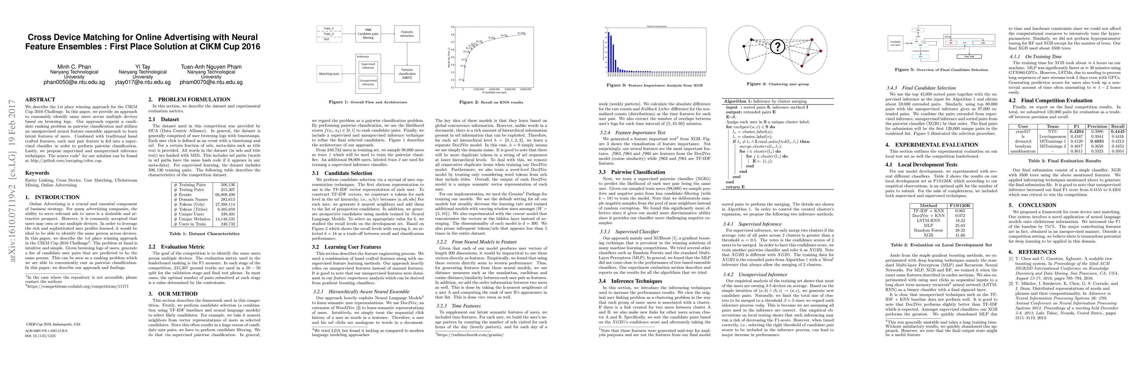 We describe the 1st place winning approach for the CIKM Cup 2016 Challenge. In this paper, we provide an approach to reasonably identify same users across multiple devices based on browsing logs. Our approach regards a candidate ranking problem as pairwise classification and utilizes an unsupervised neural feature ensemble approach to learn latent features of users. Combined with traditional hand crafted features, each user pair feature is fed into a supervised classifier in order to perform pairwise classification. Lastly, we propose supervised and unsupervised inference techniques.