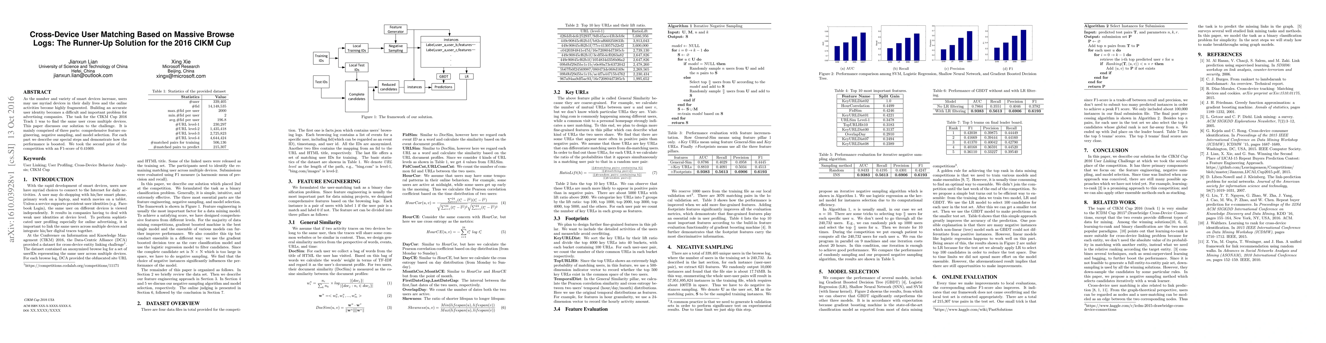 As the number and variety of smart devices increase, users may use myriad devices in their daily lives and the online activities become highly fragmented. Building an accurate user identity becomes a difficult and important problem for advertising companies. The task for the CIKM Cup 2016 Track 1 was to find the same user cross multiple devices. This paper discusses our solution to the challenge. It is mainly comprised of three parts: comprehensive feature engineering, negative sampling, and model selection. For each part we describe our special steps and demonstrate how the performance is boosted. We took the second prize of the competition with an F1-score of 0.41669.