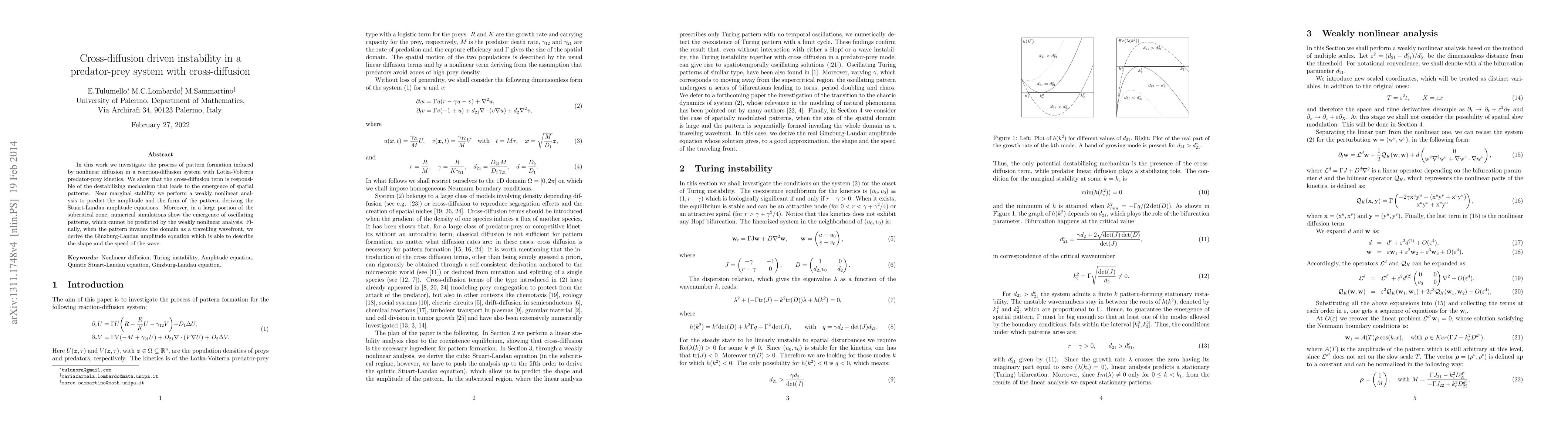 This paper explores pattern formation in a predator-prey system driven by nonlinear cross-diffusion, revealing that cross-diffusion destabilizes the system and leads to spatial patterns. A weakly nonlinear analysis near marginal stability predicts pattern amplitude and form, but numerical simulations show additional complex oscillating patterns beyond this analysis.
